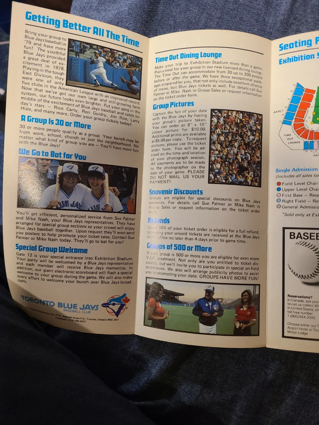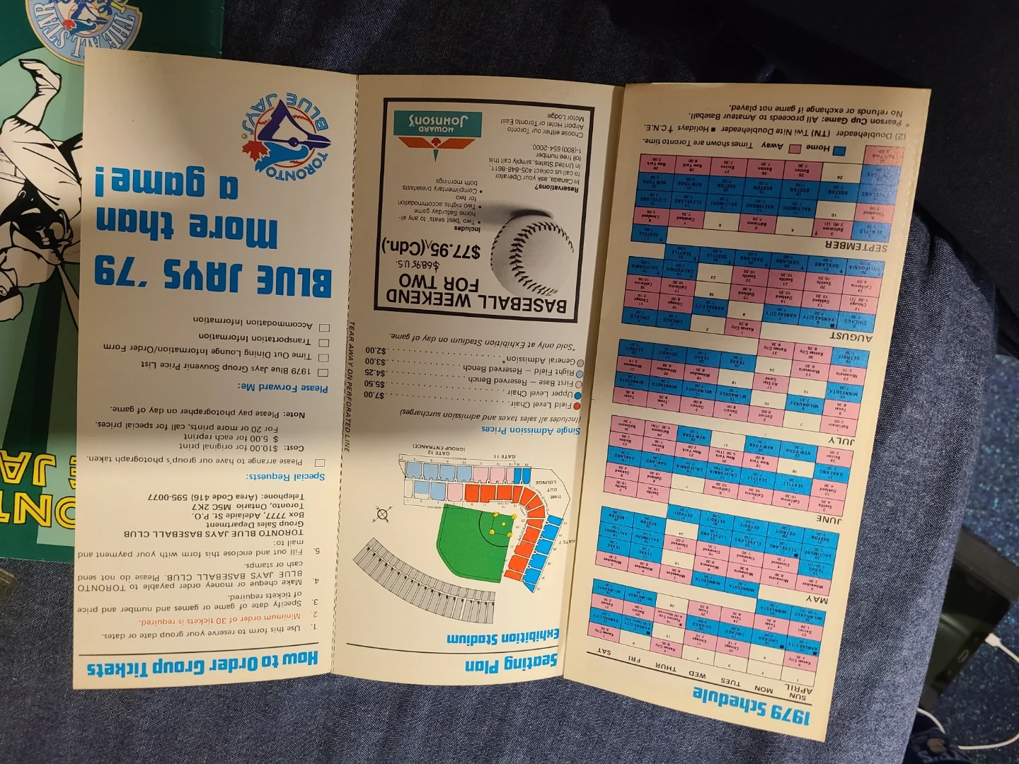 This is the 1979 Toronto Blue Jays schedule. It includes special days, junior Jays days, senior citizens days, and teen nights. The back provides seating information and how to order group tickets.