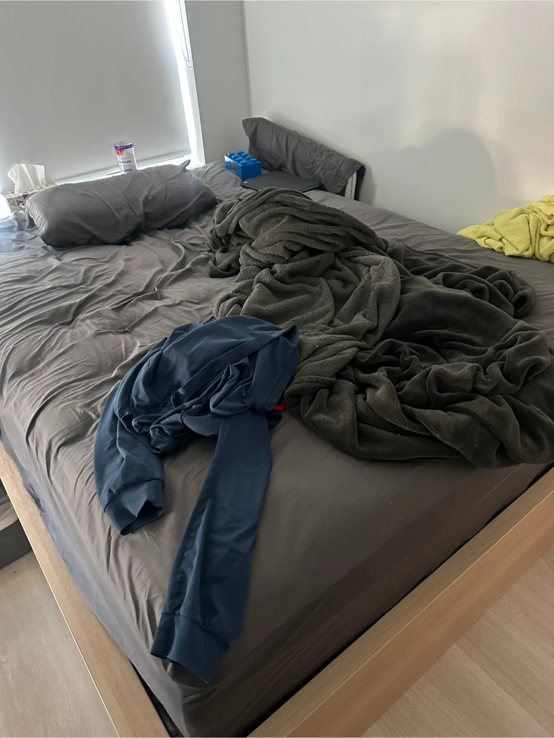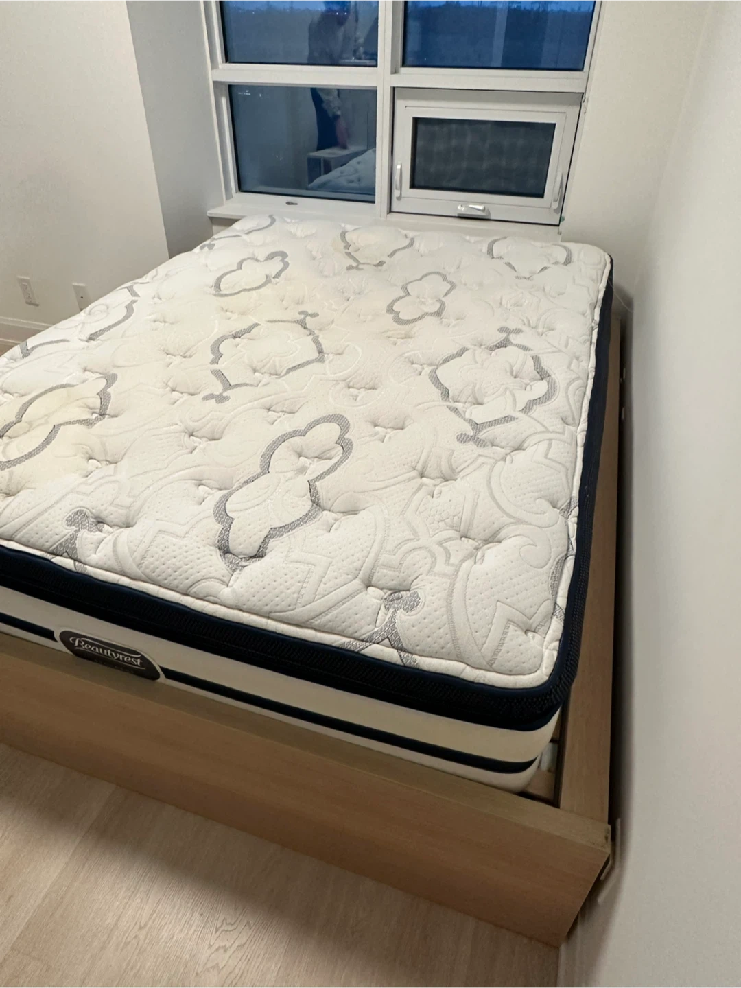 Selling a Beautyrest Queen size mattress and wooden frame. It's a hybrid model with a quilted top. Offers good support and comfort for sleep.