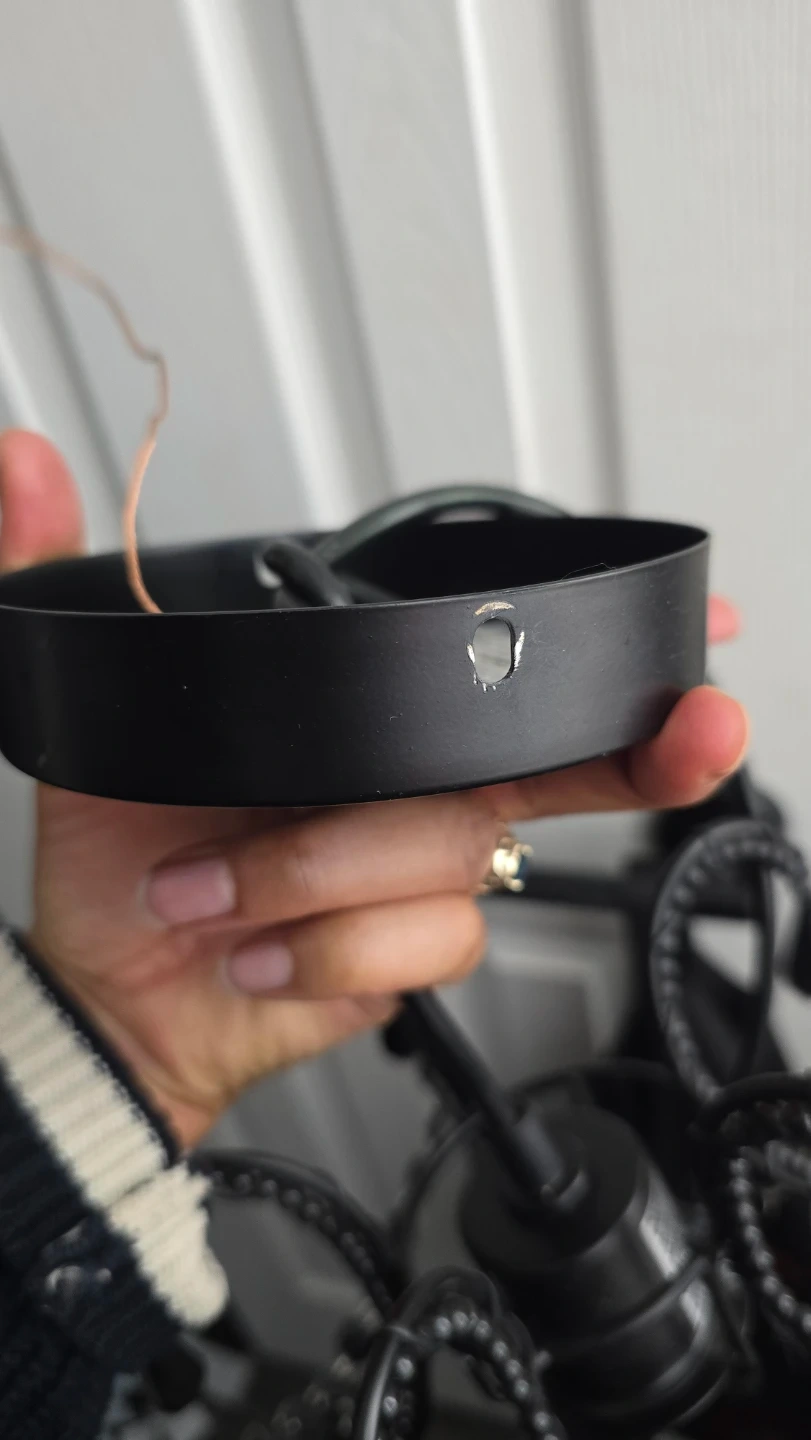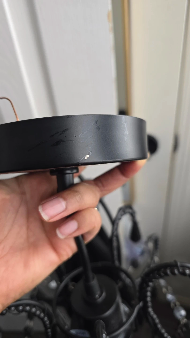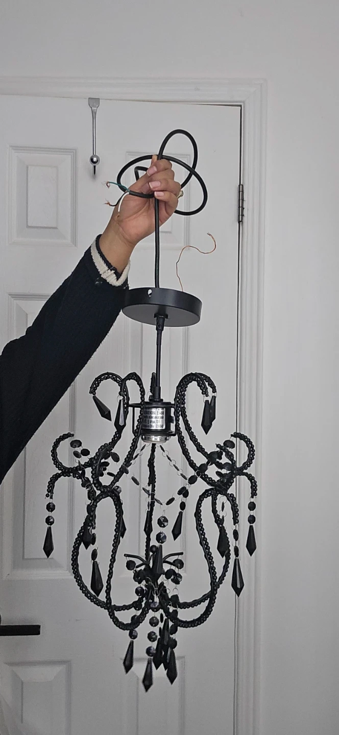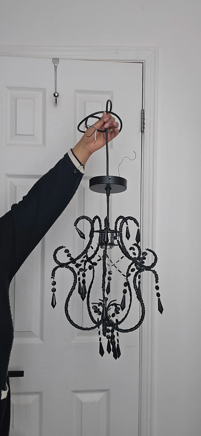 This black chandelier-style light fixture adds a touch of elegance. It's designed with decorative beads and hanging crystals. A great addition for entryways or dining areas!