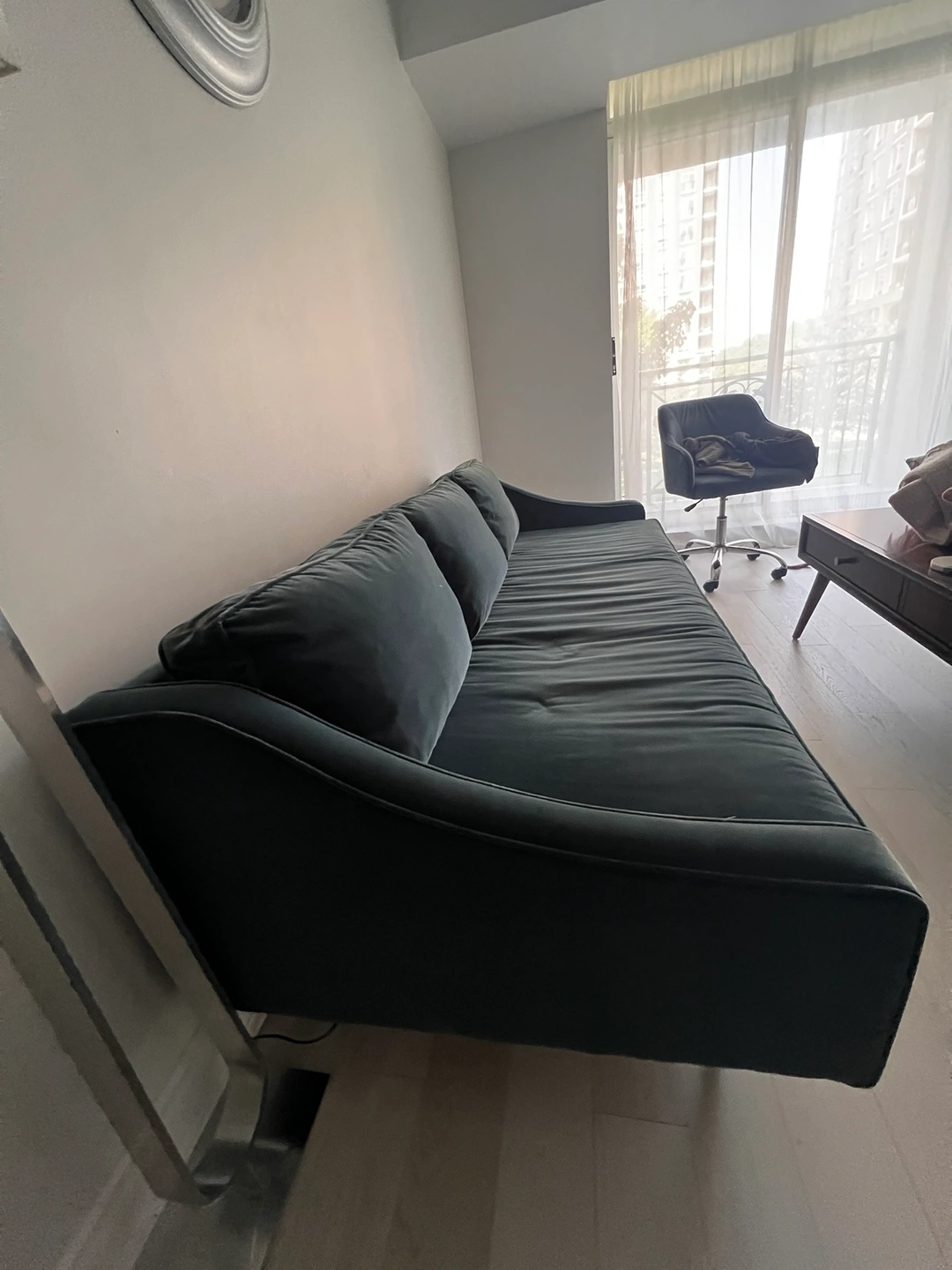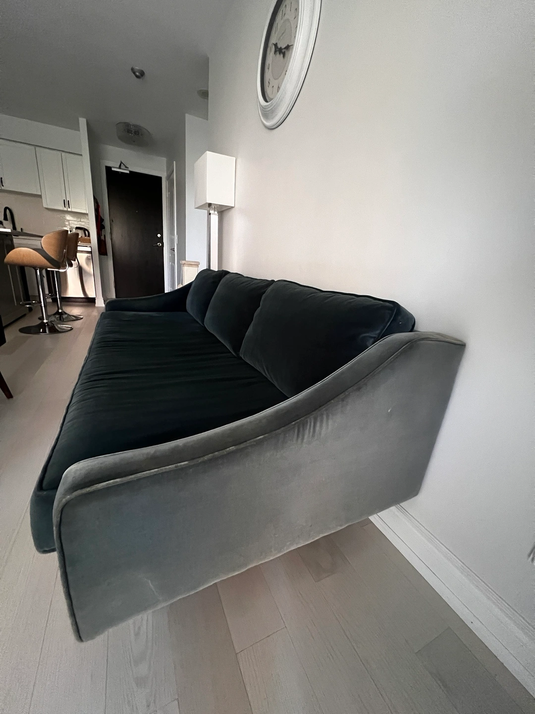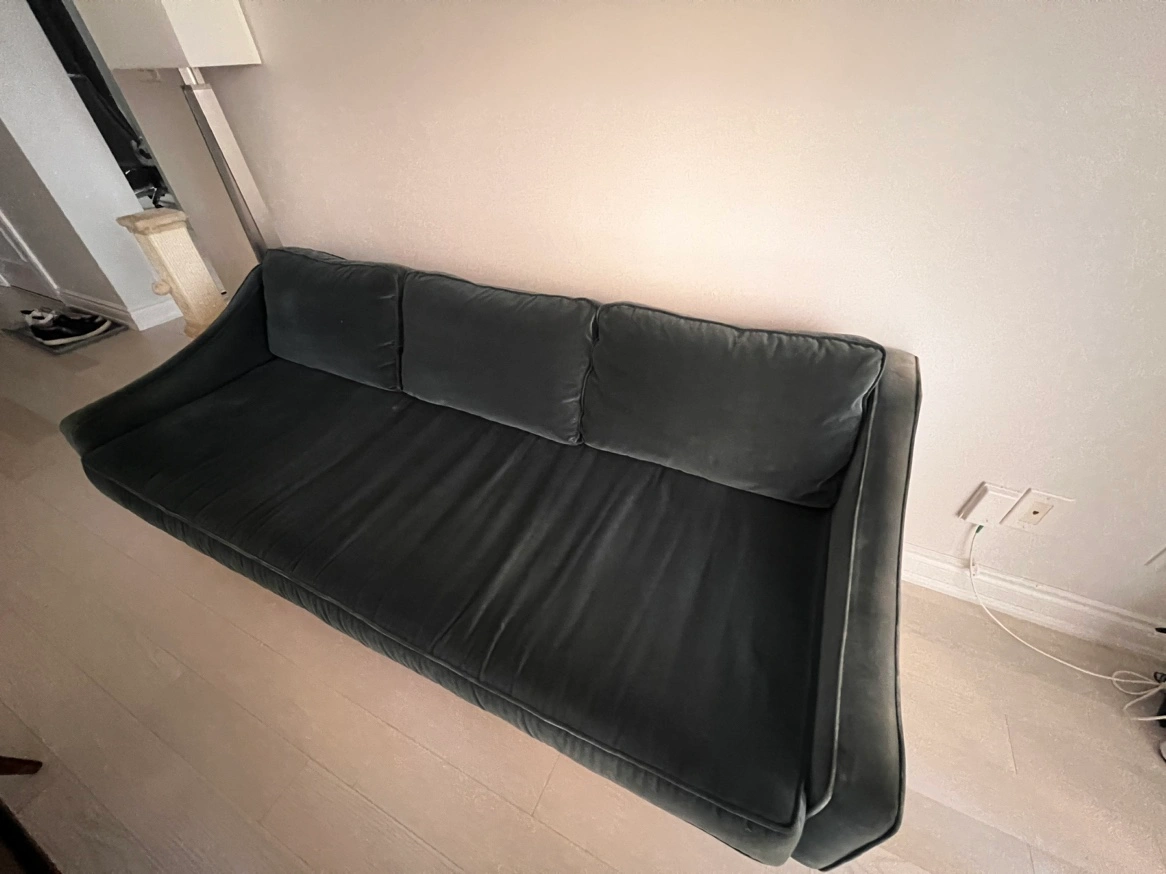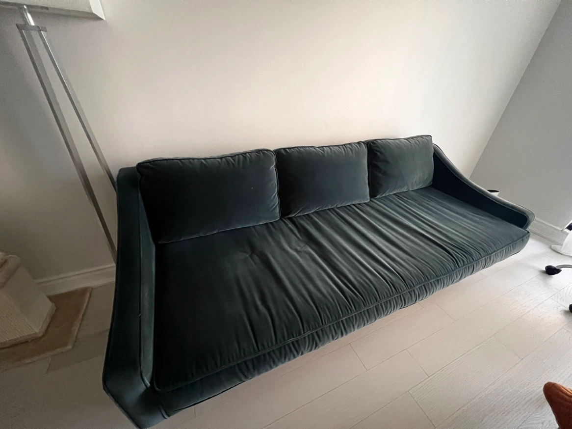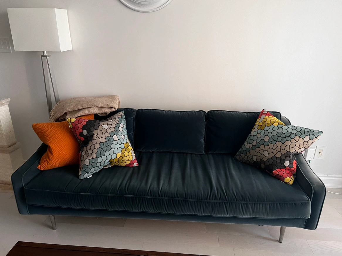 Article velvet sofa (anti scratch), dark teal, good condition. Original price was $1300. Pillows and base cases are removable.
