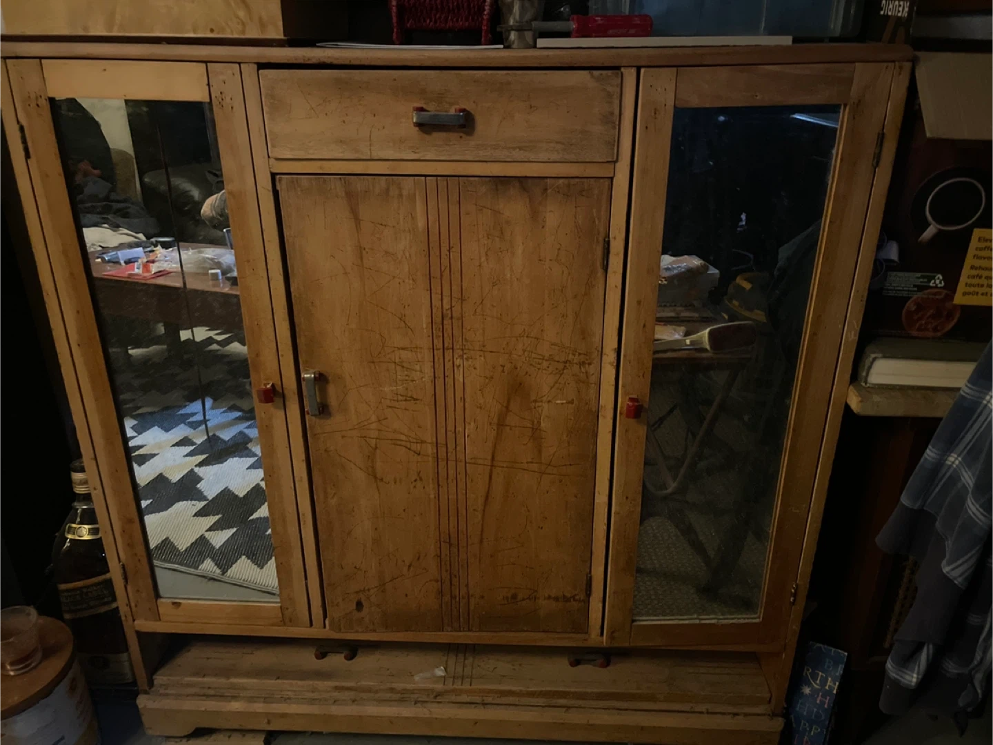 This is a wooden cabinet with two mirrored doors on the sides and two solid doors in the centre. It features a single drawer at the top. The wood shows some wear and scratches. It's a handy storage piece.
