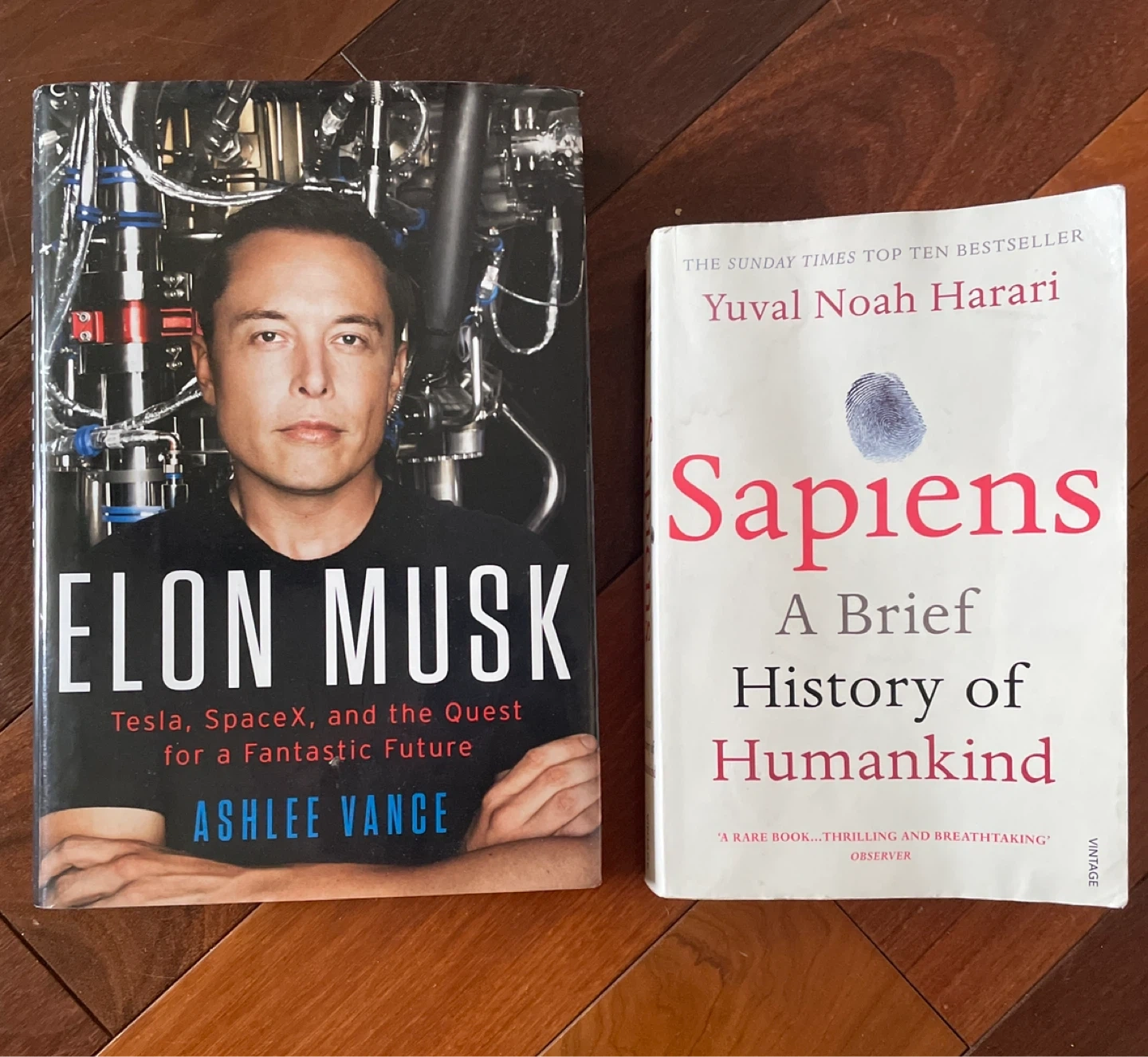Two books: 'Elon Musk: Tesla, SpaceX, and the Quest for a Fantastic Future' by Ashlee Vance (Hard Cover). Also 'Sapiens: A Brief History of Humankind' by Yuval Noah Hariri (paperback).