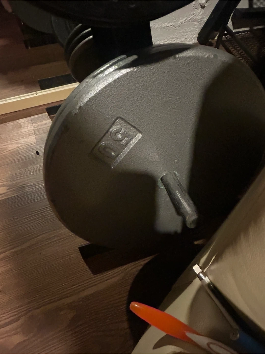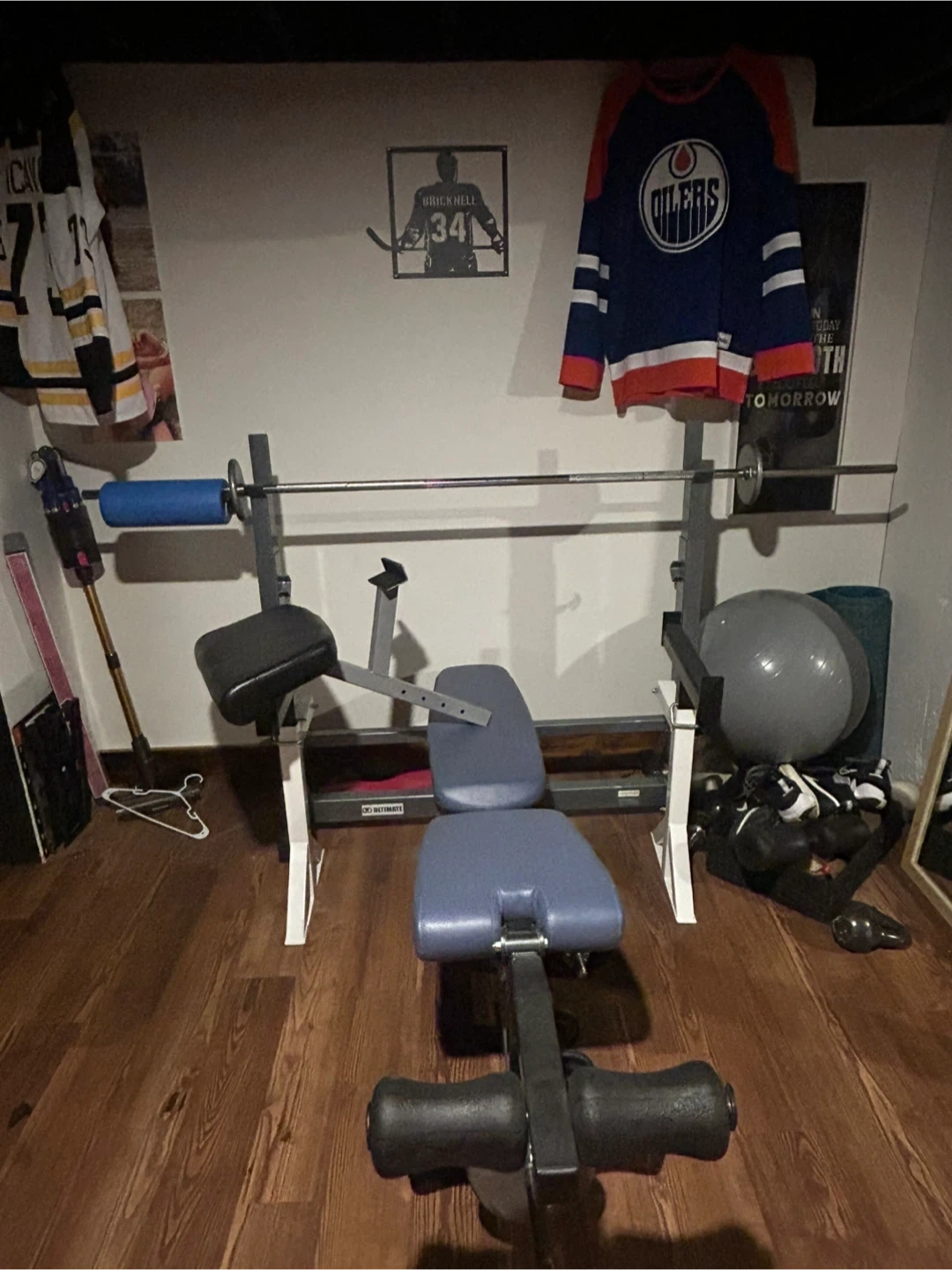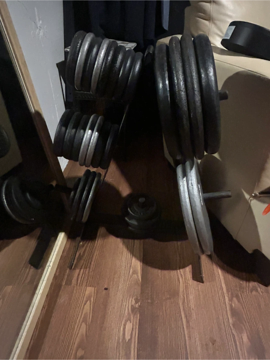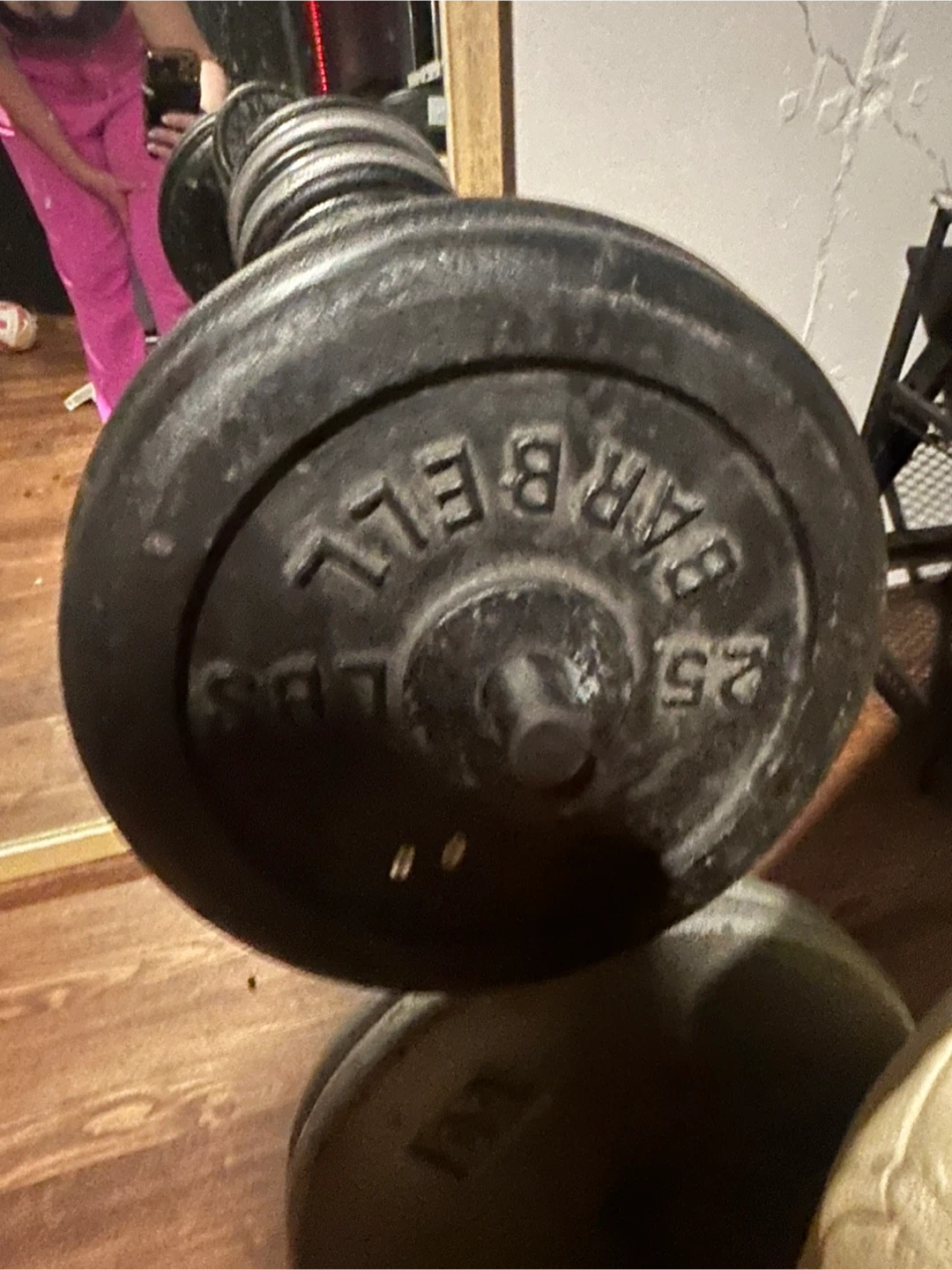 Includes various weight plates marked up to 50 lbs and a barbell. Great for home workouts! Plates are cast iron and steel. Barbell is standard size.