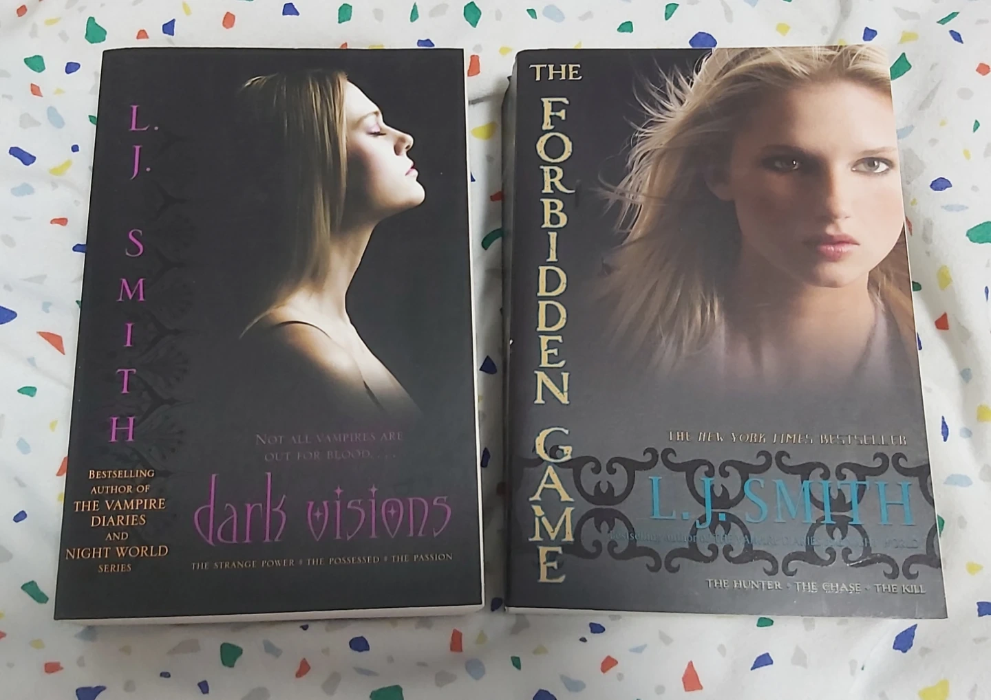 Two books by L.J. Smith: 'Dark Visions' trilogy and 'The Forbidden Game' trilogy