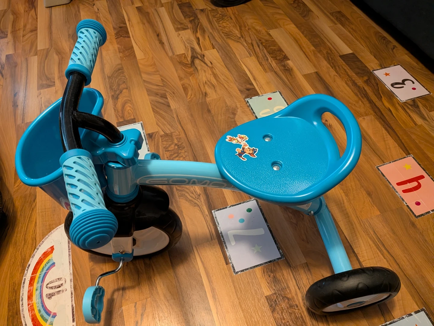 This bright blue toddler tricycle features a parent push handle for guidance. It has comfortable grip handles and a seat for your little one. A fun way for kids to explore outdoors!