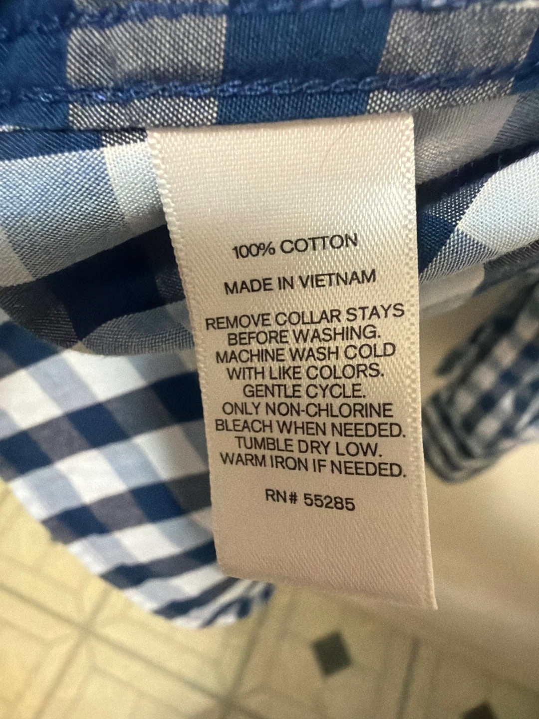 Express long-sleeve dress shirt in a blue gingham pattern. Extra slim fit with a button-up front. Made of 100% cotton.