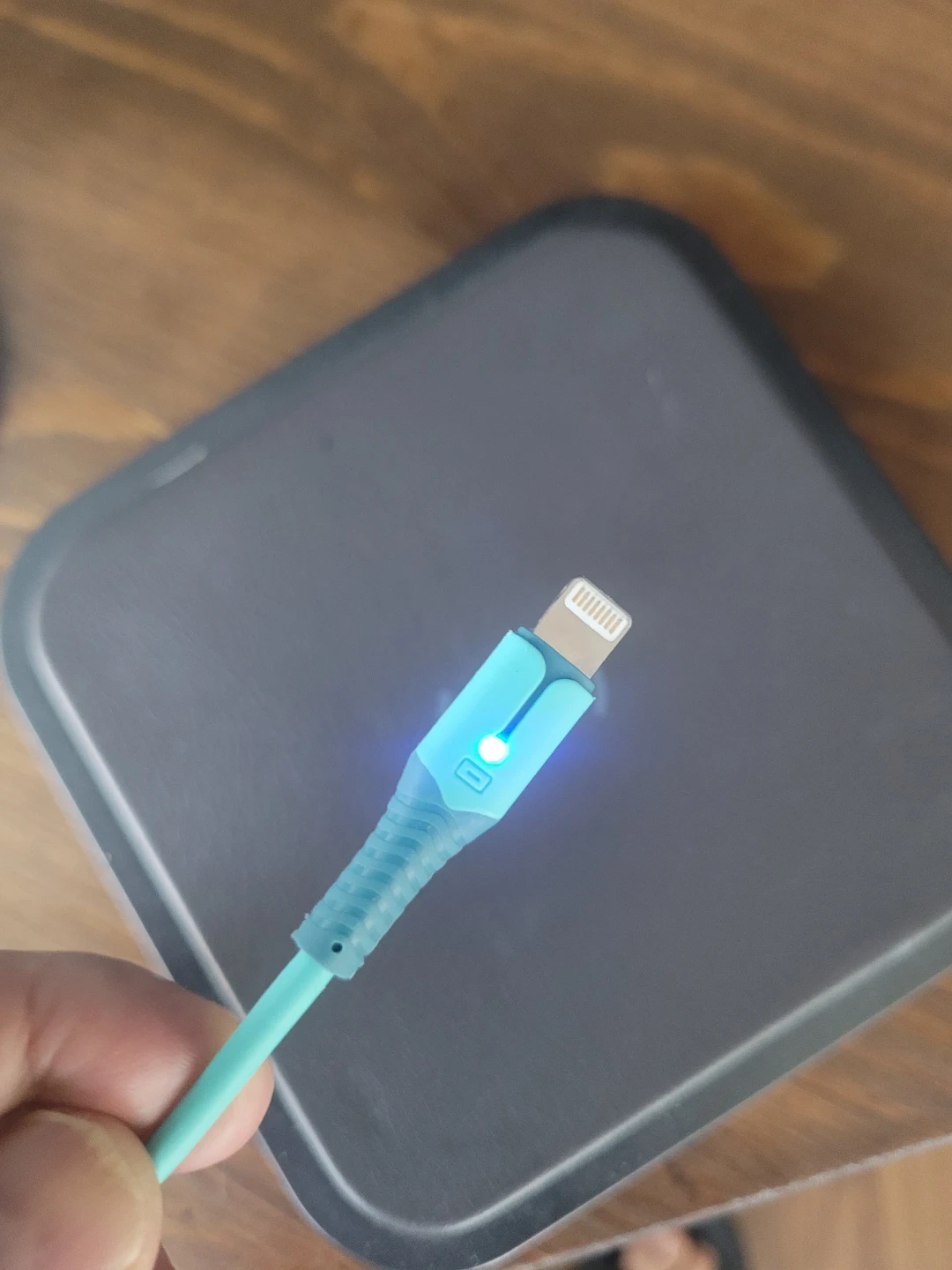 A blue USB to Lightning charging cable is included. It's about 40 inches long and has a small indicator light near the Lightning connector. This cable works with Apple devices.