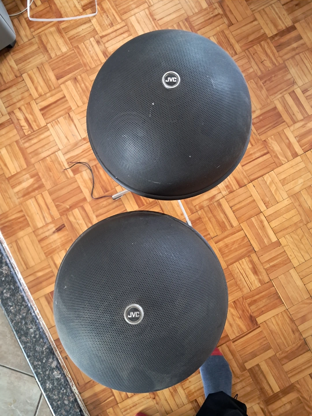 A pair of JVC sphere speakers mounted on adjustable stands. They're black with a perforated grille and a silver JVC logo. These would be great for a retro audio setup!
