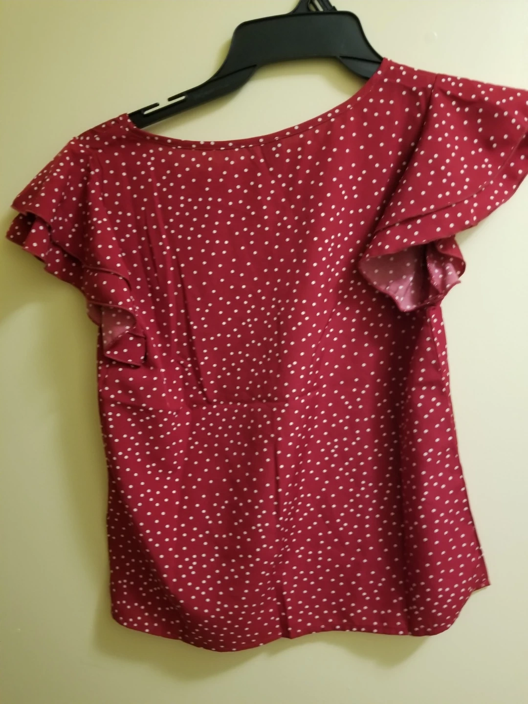 Charming red blouse with a classic white polka dot pattern. It features stylish flutter sleeves and a flattering V-neckline. Material is lightweight and breathable. Size is XS