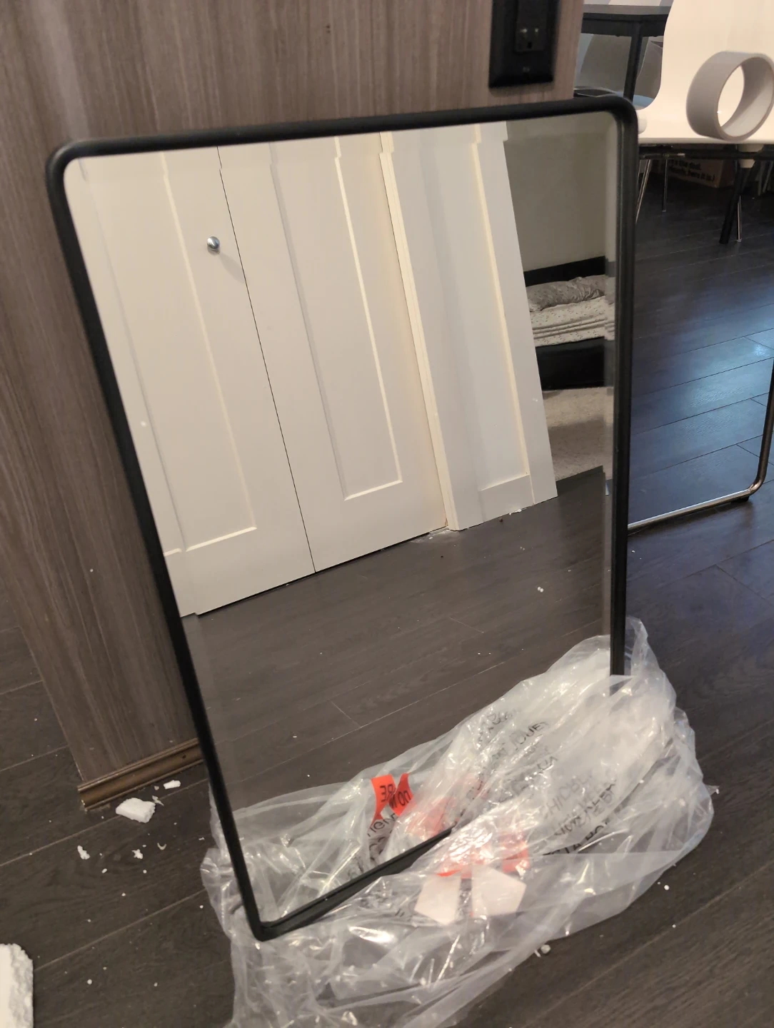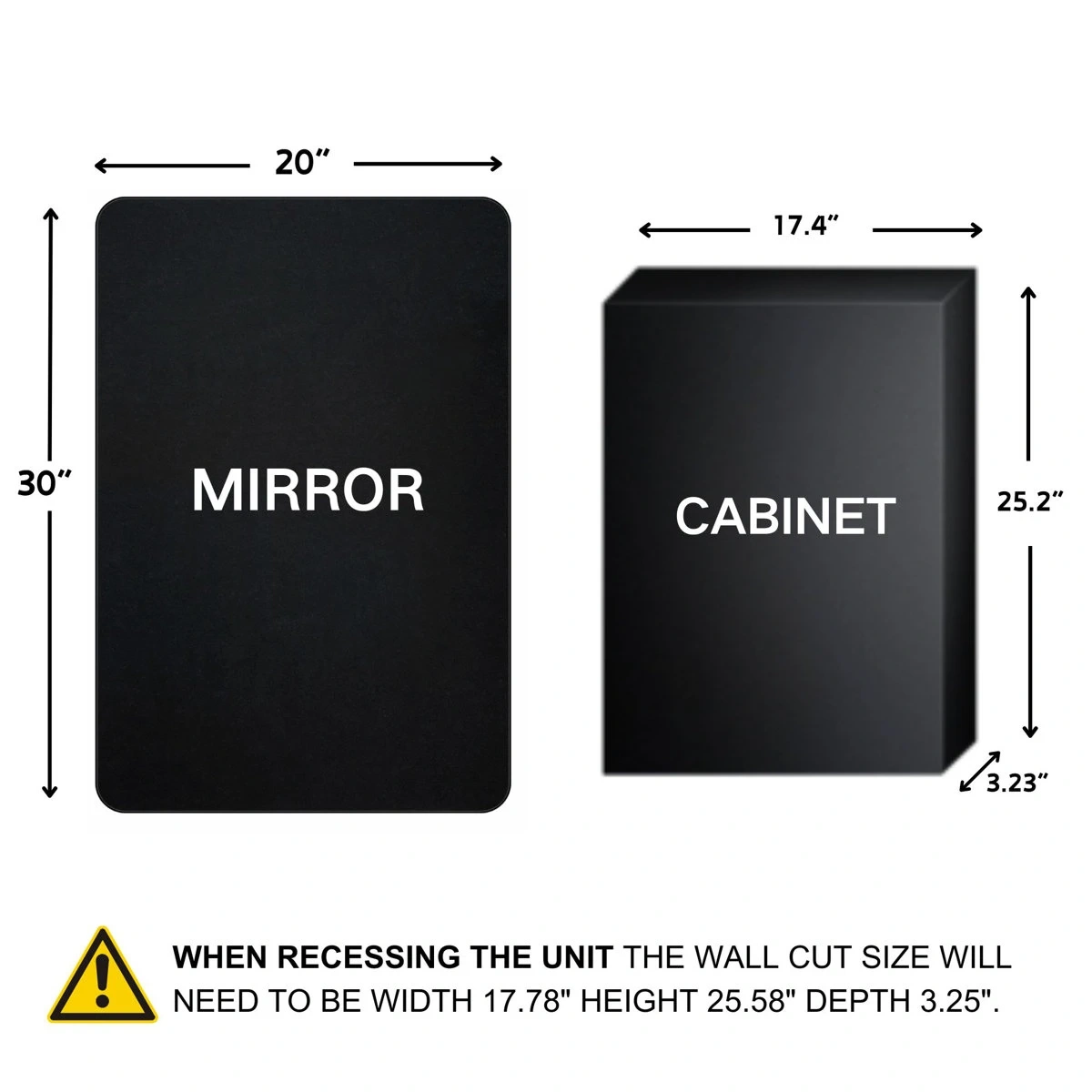 This is a black framed wall mirror with recessed storage. The mirror measures 20 inches wide by 30 inches tall. The cabinet is 17.4 inches wide, 25.2 inches tall, and 3.23 inches deep. It's perfect for organizing bathroom essentials! Bought new for $350 from Wayfair. Taken out of box just to show for photo.