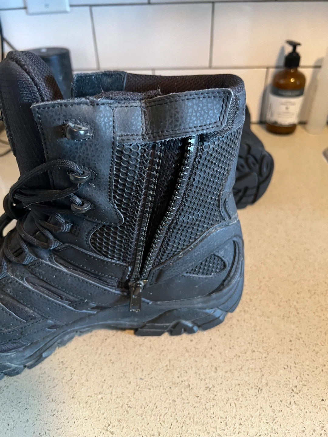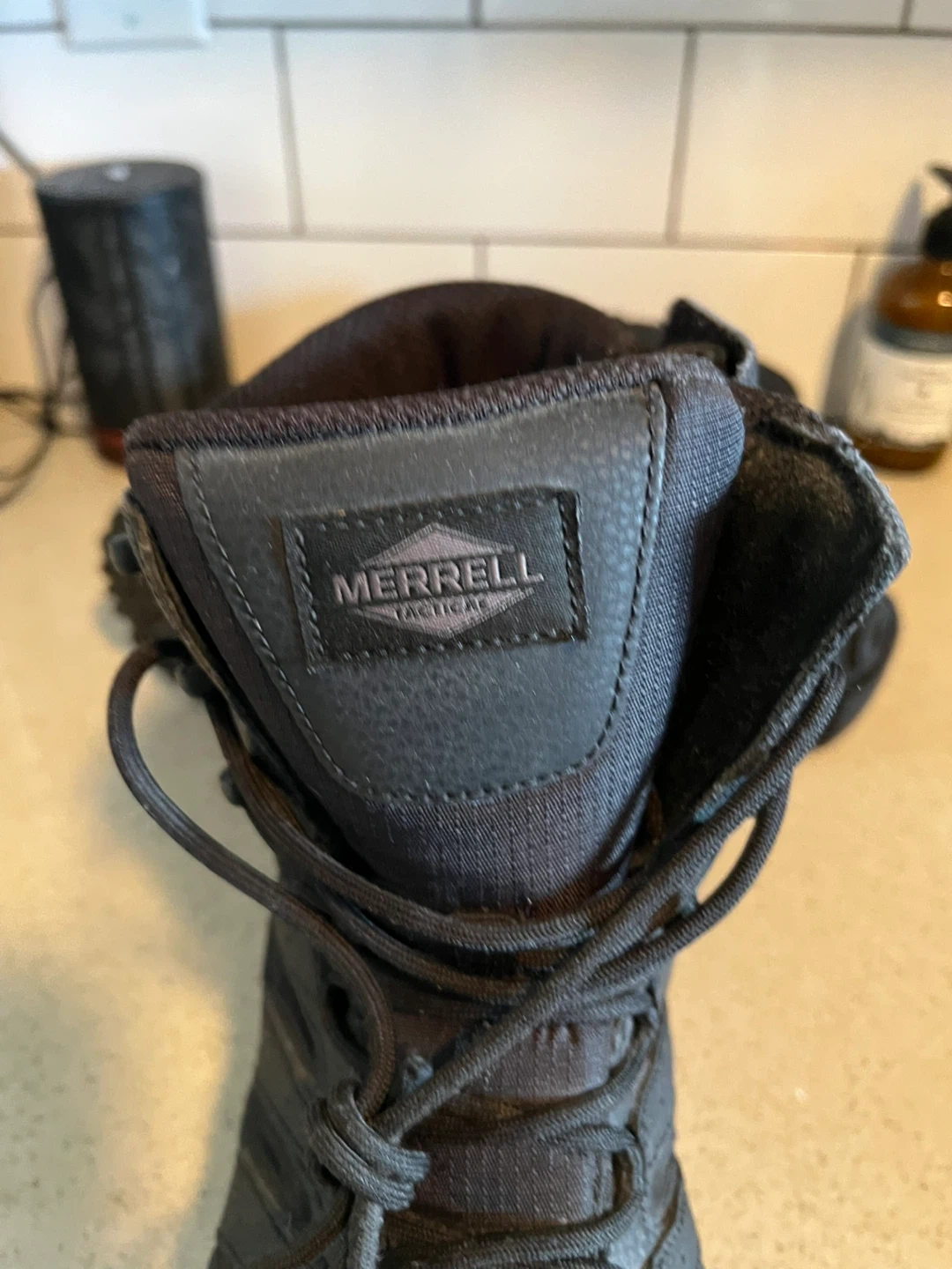 Merrell men's black winter tactical boots. These boots are size 11.5 W US They feature a side zipper/lace options and durable Vibram soles. Perfect for outdoor activities or work environments!