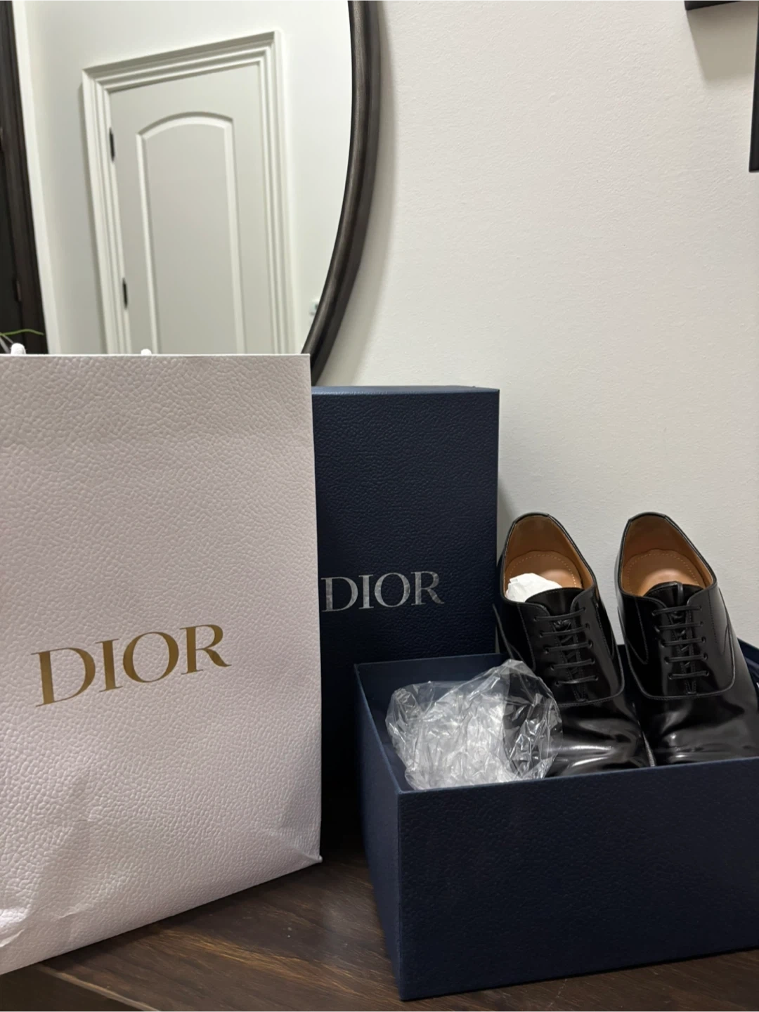 Classic black leather cap toe oxford shoes from DIOR. Made in Italy with leather soles. Comes with original box and dust bags. Perfect for dressing up any outfit!