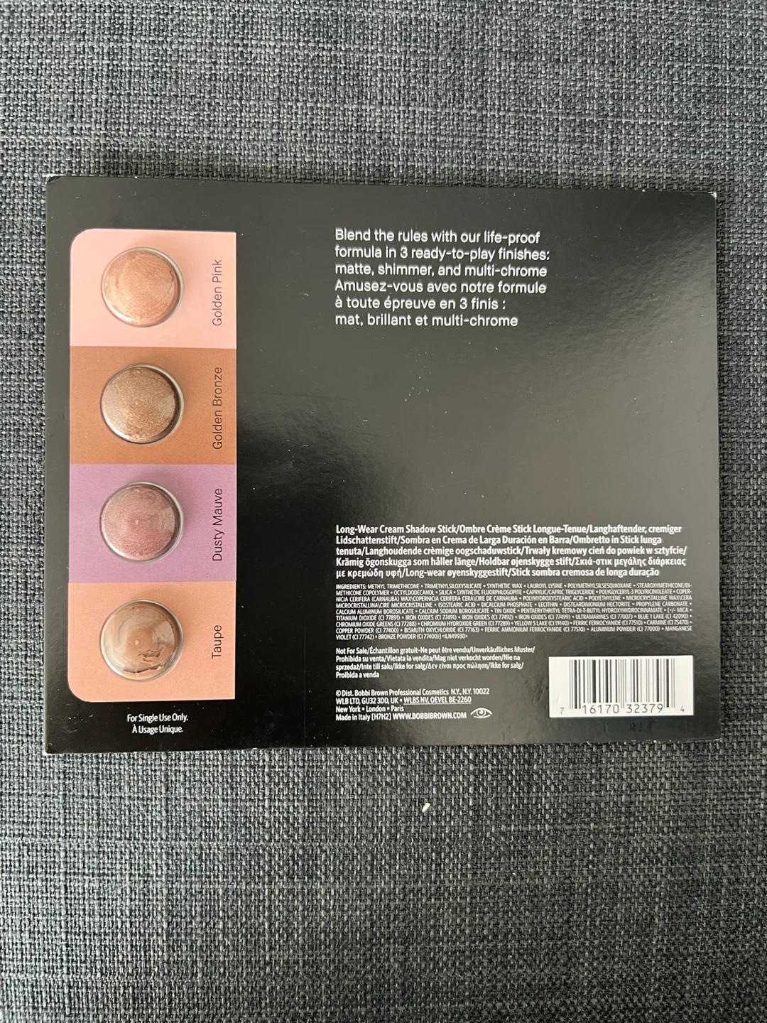 This sample set includes Bobbi Brown Long-Wear Cream Shadow Sticks in four shades: Golden Pink, Golden Bronze, Dusty Mauve, and Taupe. The formula is long-wearing and offers matte, shimmer, and multi-chrome finishes. Perfect for creating versatile eye looks on the go!