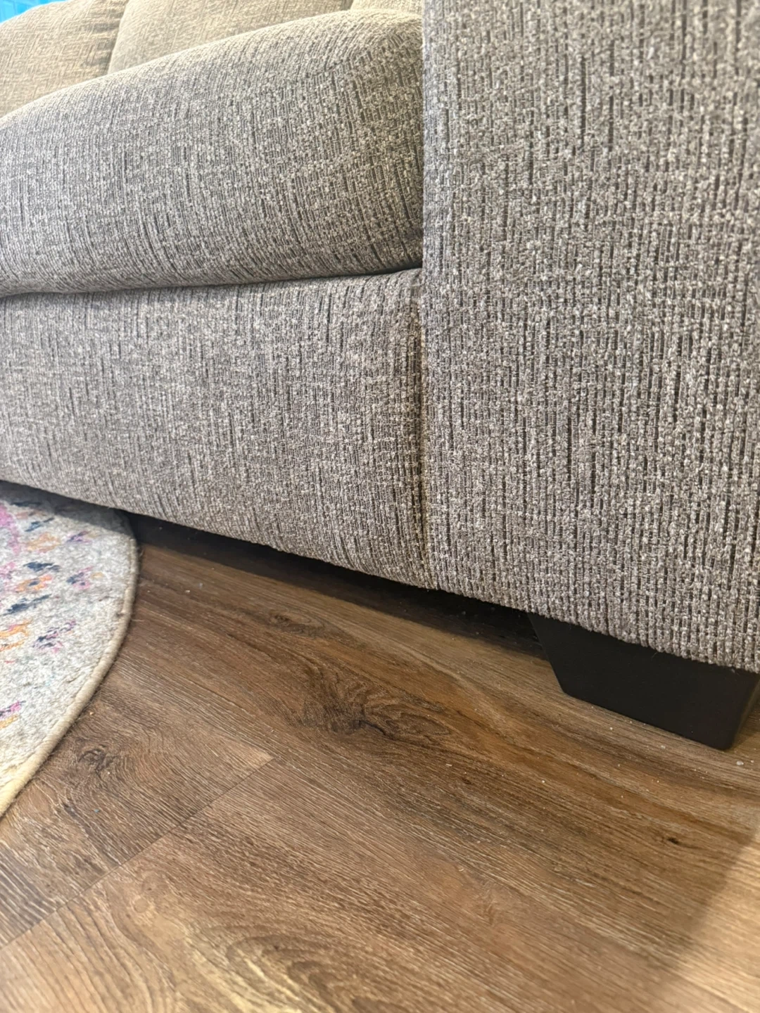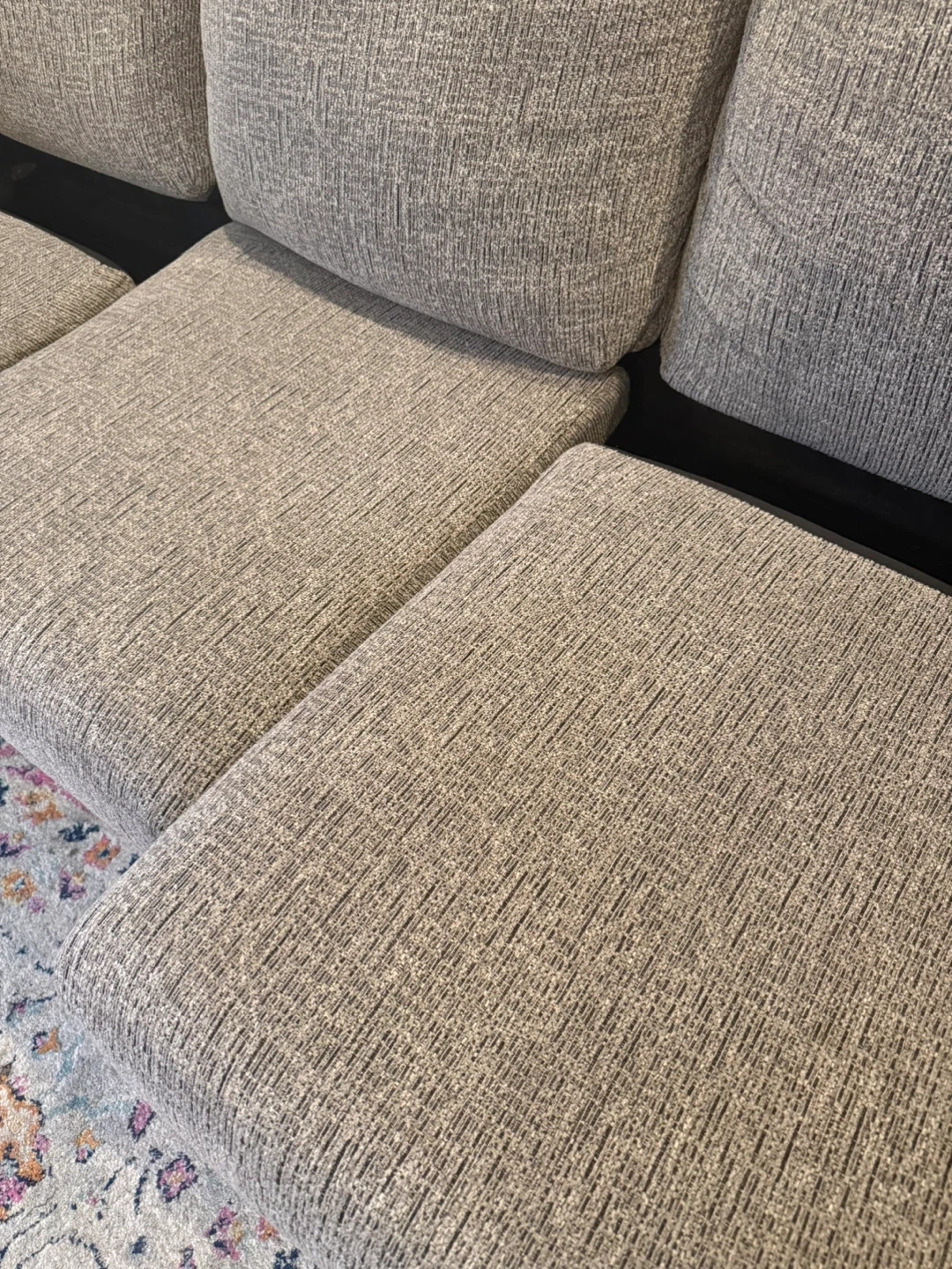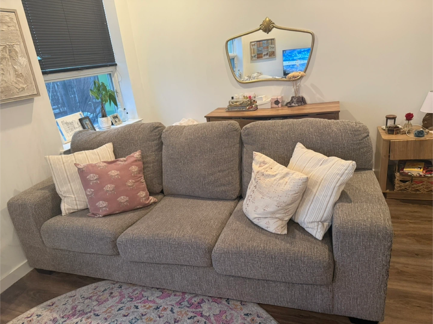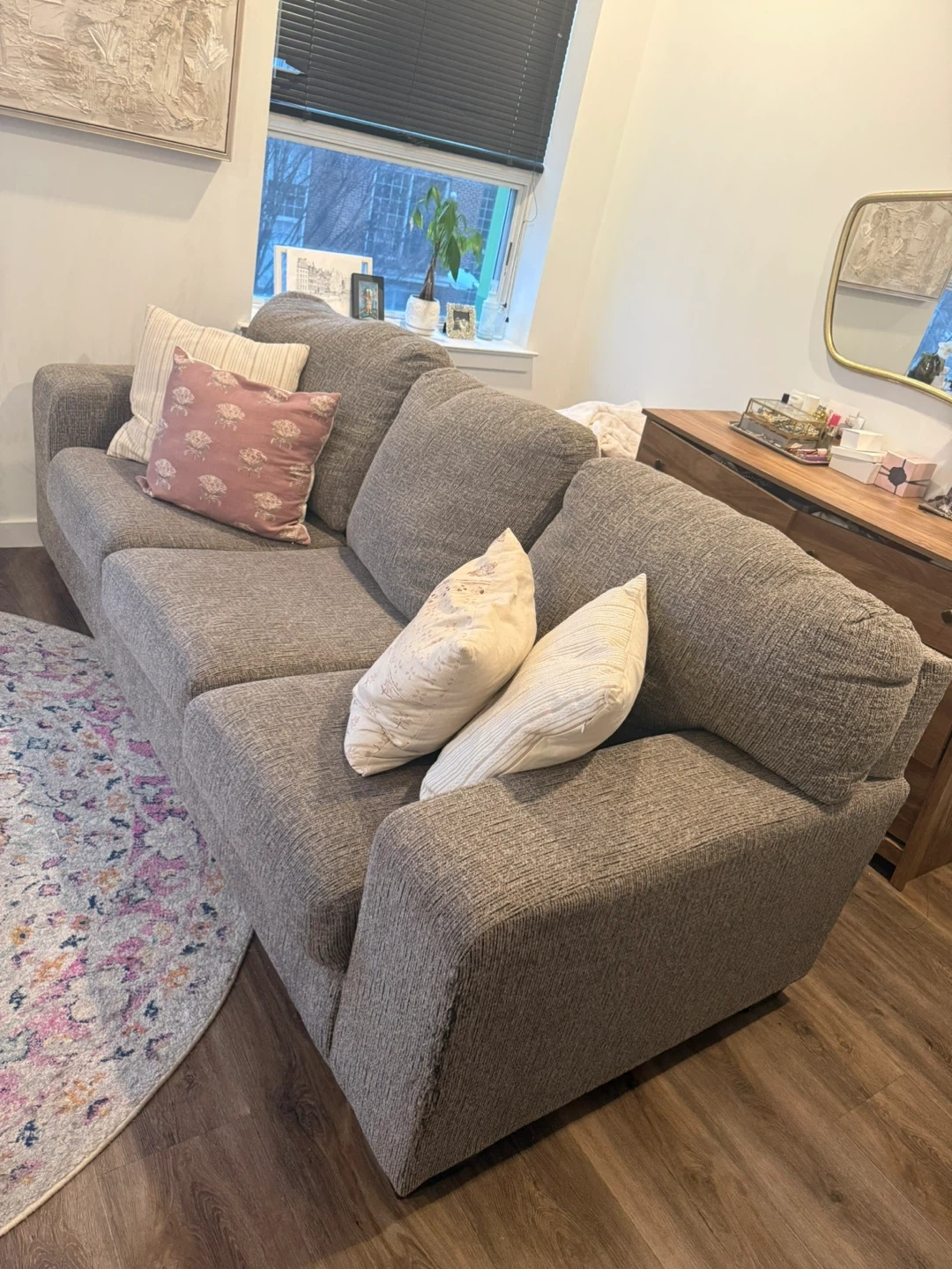 The most comfortable gray three-seater sofa. It's upholstered in a textured fabric— small signs of ware in left front and back corners as pictured. Elevator building but must be able to carry couch which requires 2 people or could pick it up around 10am morning of February 28th as scheduled movers can bring it outside