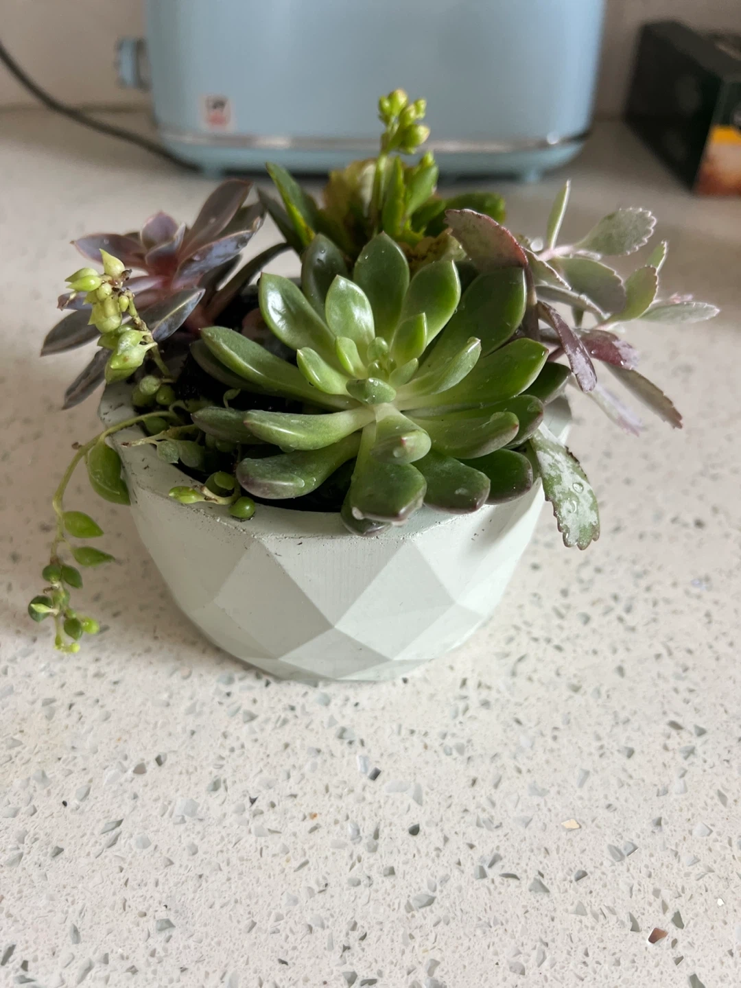This is a small, decorative succulent arrangement. It features a variety of healthy plants in a light grey geometric pot. The pot is made of concrete. It's a great way to add a touch of green to your space!