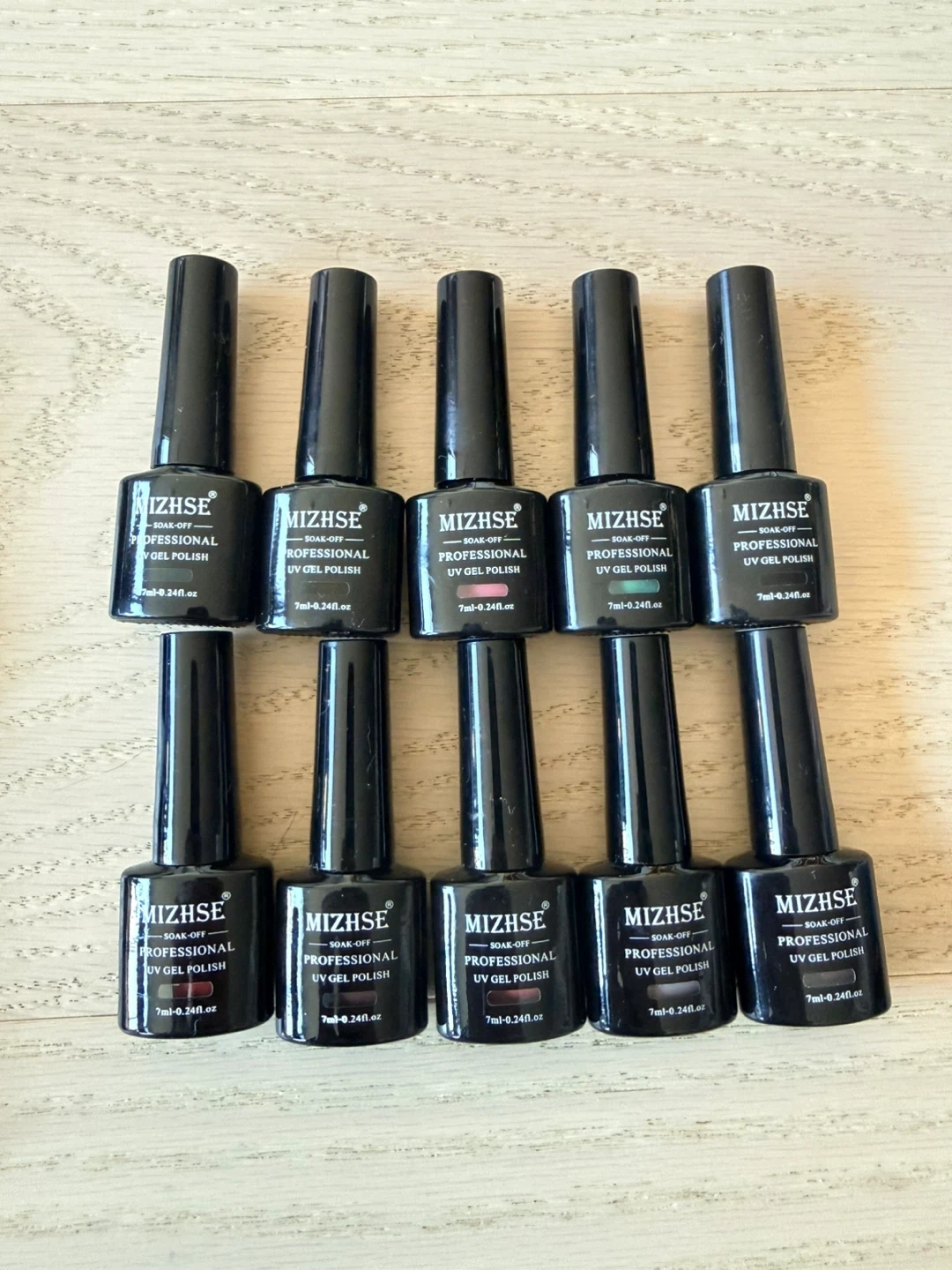 This set includes ten MIZHSE soak-off professional UV gel polish bottles. Each bottle contains 7ml (0.24fl.oz) of polish. These are designed for professional use in UV gel manicures. They offer a long-lasting, chip-resistant finish when applied with a UV lamp. A great collection for any nail technician or enthusiast!