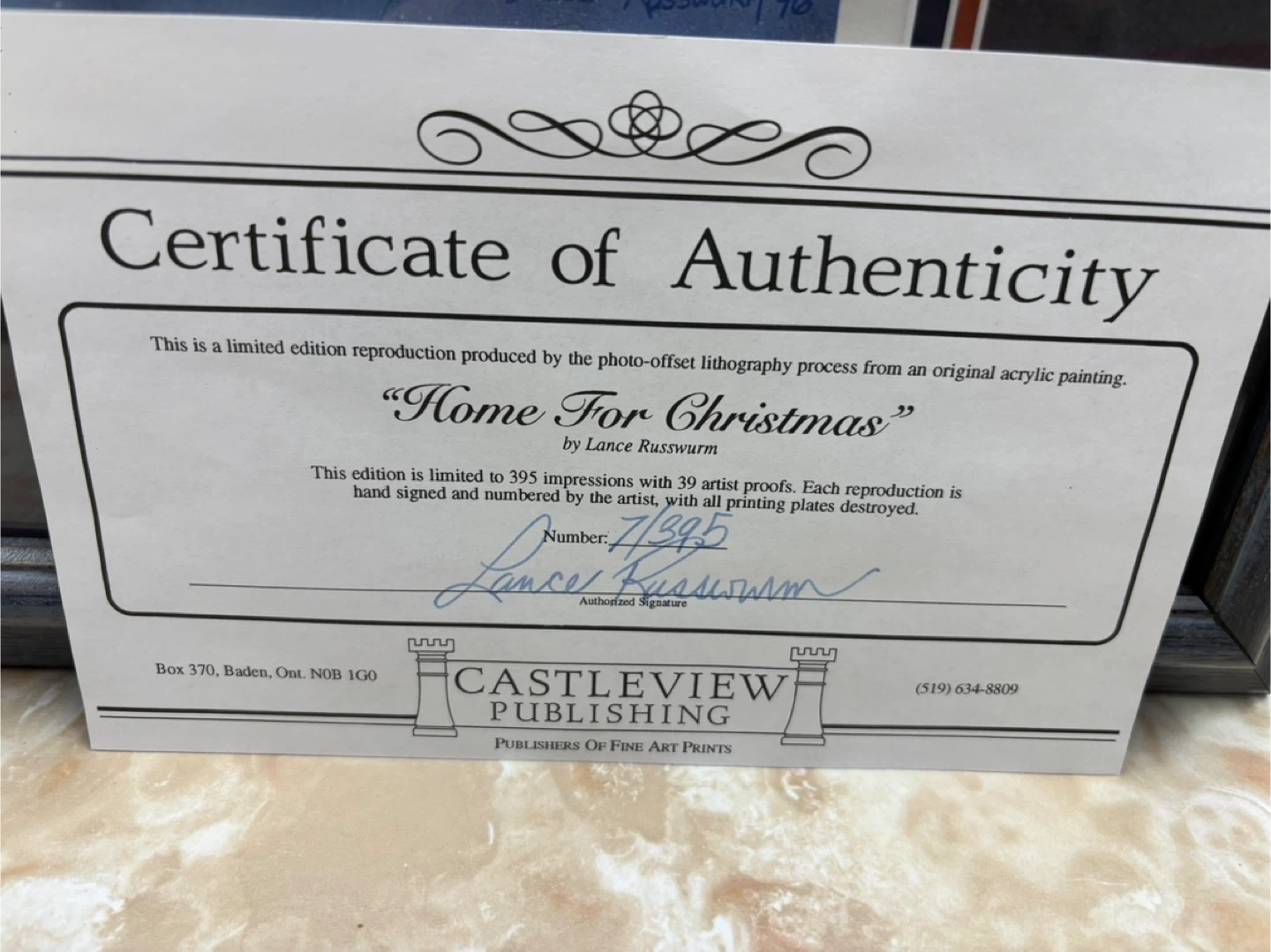 Selling a framed print of "Home For Christmas" by Lance Russwurm. It's a limited edition reproduction from Castleview Publishing. This one is number 7/395.