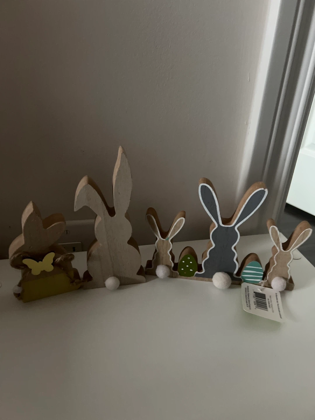 This set includes several wooden bunnies and Easter eggs, perfect for seasonal decor. It's made of wood with some painted details and small fuzzy pom-poms. Adds a cute touch to any home for spring celebrations!