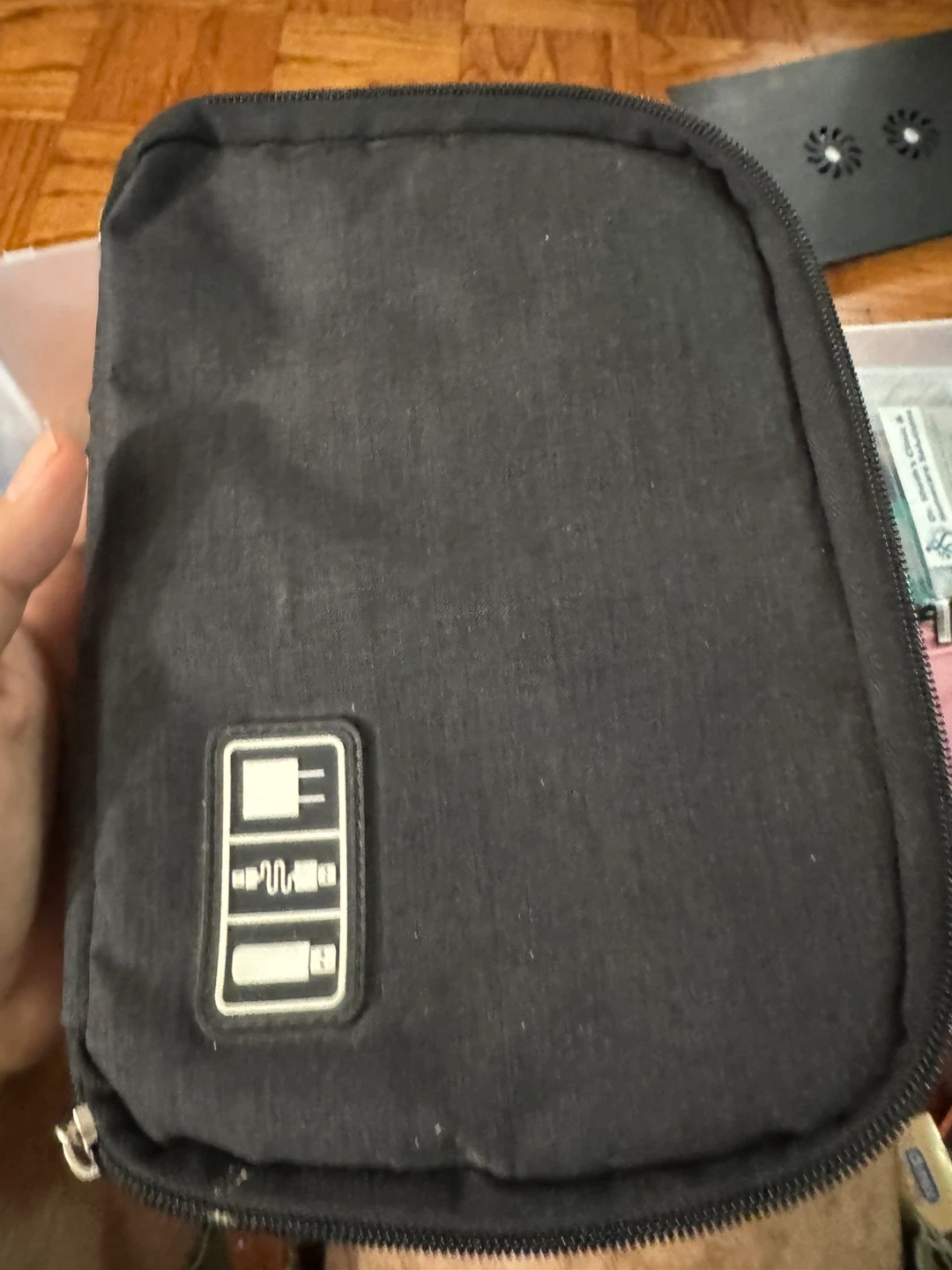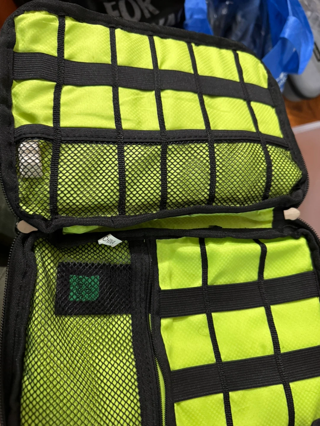 This is a black organizer pouch designed for electronics accessories. It features multiple elastic straps and mesh pockets inside to keep cables, chargers, and small devices neatly stored. The compact size makes it easy to carry.
