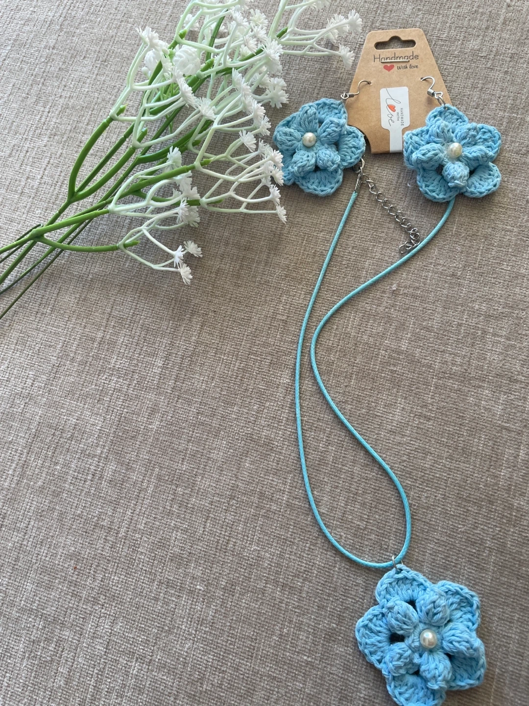 A set of handmade crochet flower earrings and a matching necklace. Available in beige, green, yellow, and blue.
