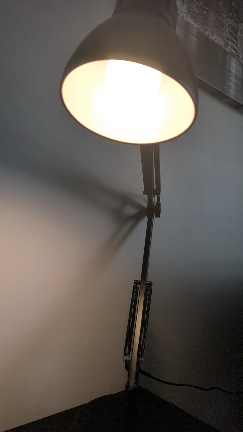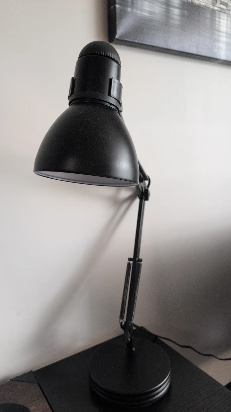 A sturdy black desk lamp with an adjustable arm and head. It has a classic dome shade and a weighted base for stability. Perfect for illuminating your workspace or reading nook!