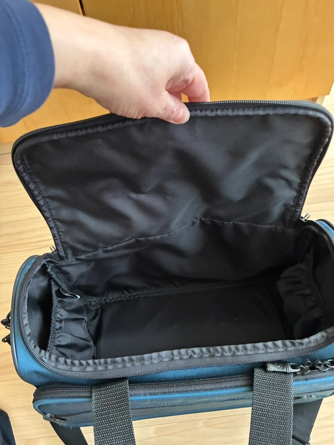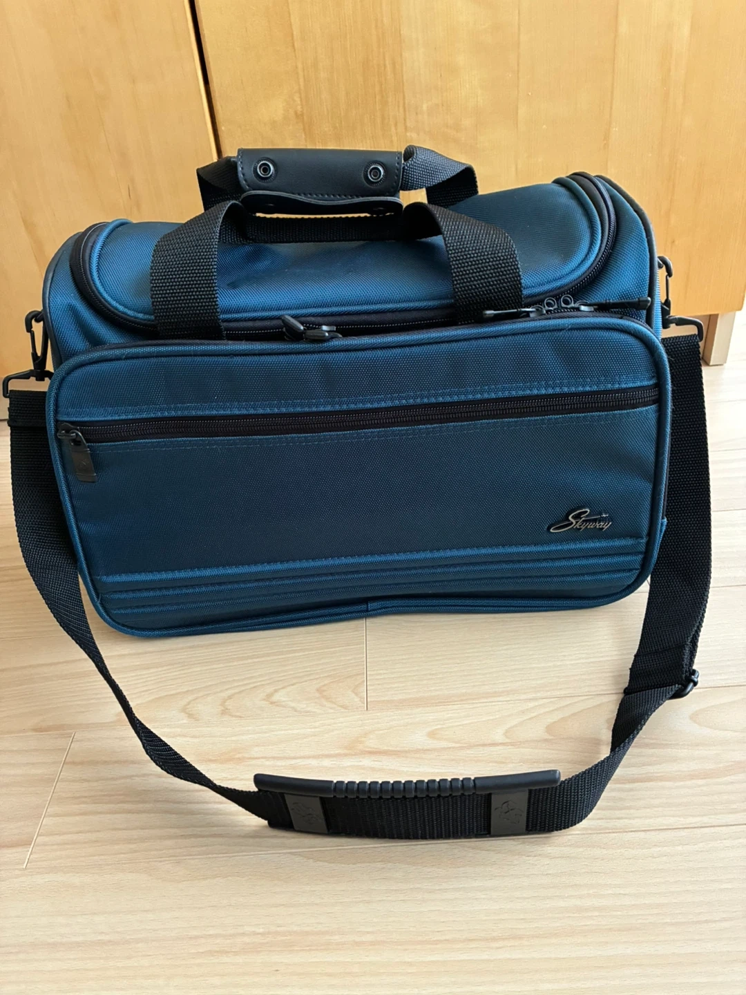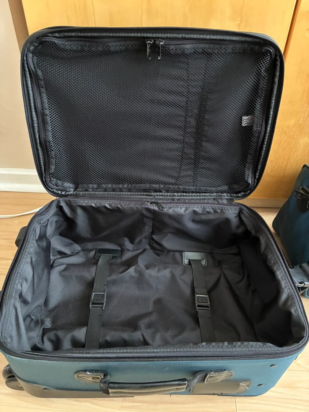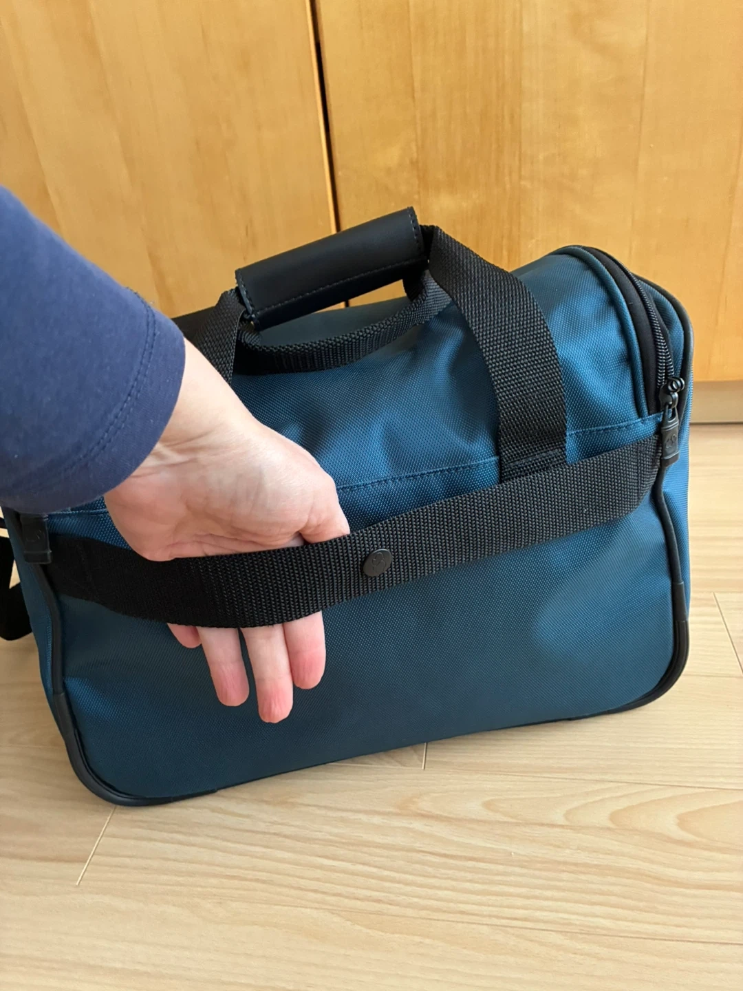 - carry-on has two handles, shoulder strap and a pull thru trolley strap