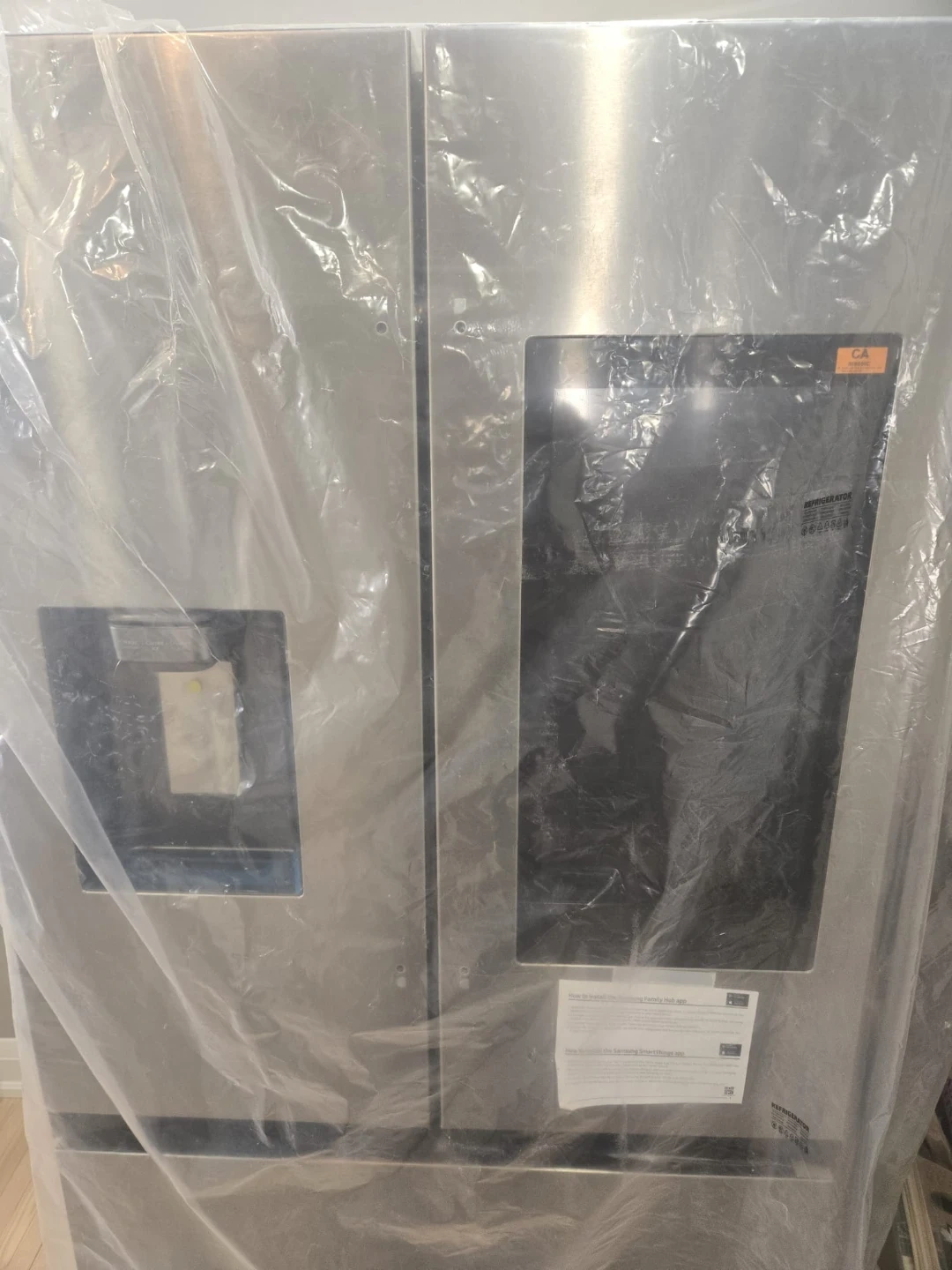 This Samsung InstaView refrigerator with an ice and water dispenser, refrigerator is brand new and still has its protective plastic covering on. It has a handy door-in-door compartment and a sleek stainless steel finish. You can see inside without opening the door thanks to the InstaView panel, which saves energy!