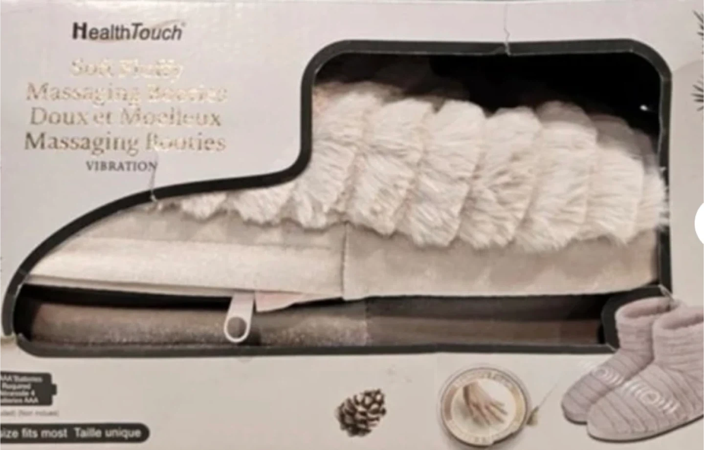 HealthTouch Soft Fluffy Massaging Booties with vibration. Made with a soft, fluffy material. One size fits most. Requires 4 AAA batteries, not included. Pick up border of Brampton and Caledon
