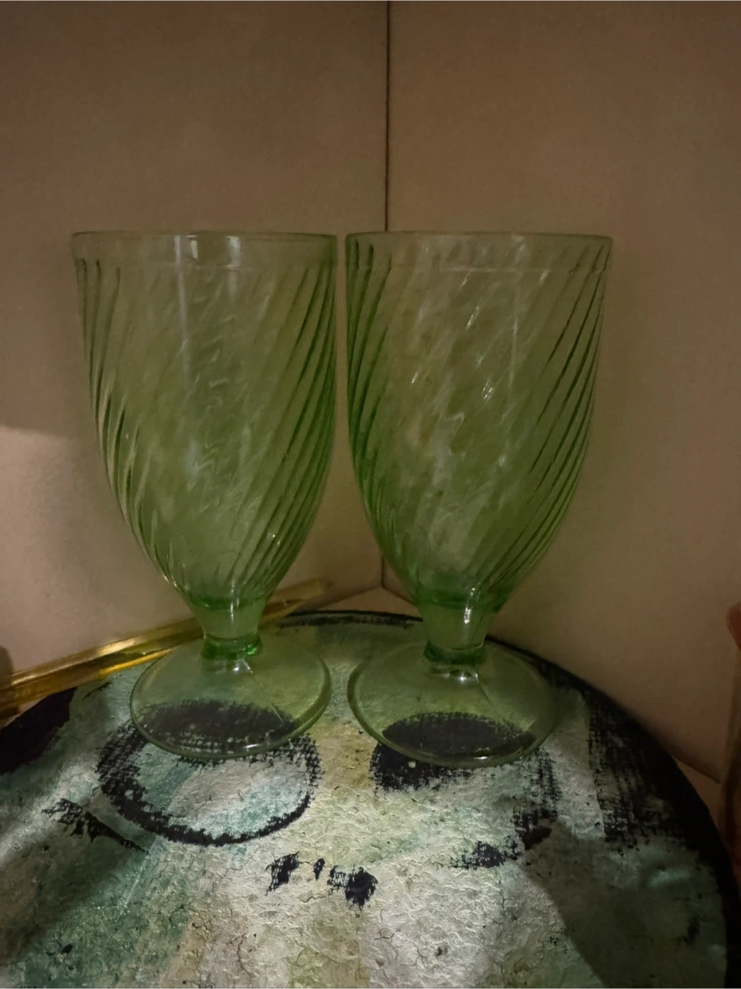 These are two green glass goblets with a swirl design. They're great for serving beverages! Uranium glass glow green just can’t find my uv light