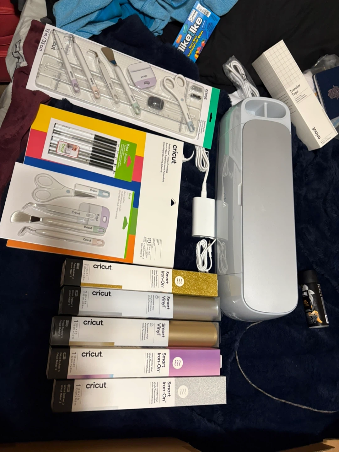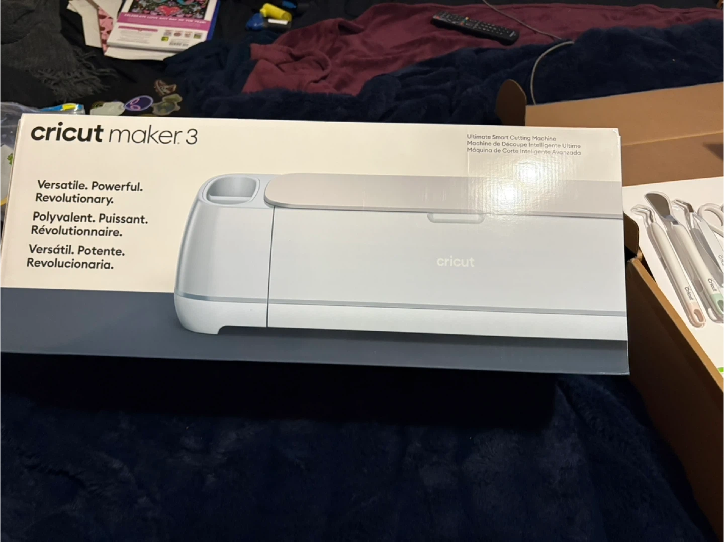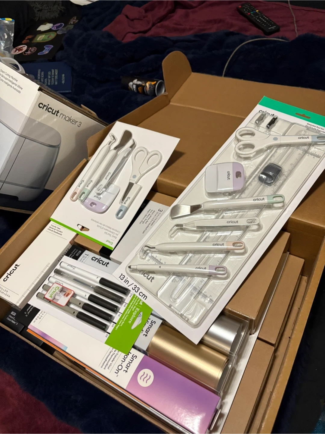 This Cricut Maker 3 smart cutting machine comes with a full bundle of accessories and materials. It includes the Cricut Tools Basic Set, a 13 in basic trimmer, and various smart vinyl and iron-on materials. It's perfect for crafters and DIY enthusiasts looking to expand their creative projects.