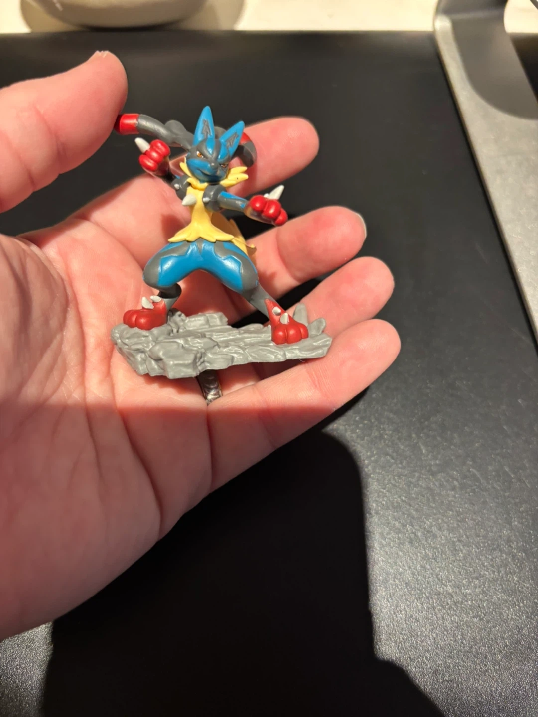 A Pokémon action figure of Lucario. This collectible displays the character in a dynamic pose on a rock-like base. It's made of durable plastic.