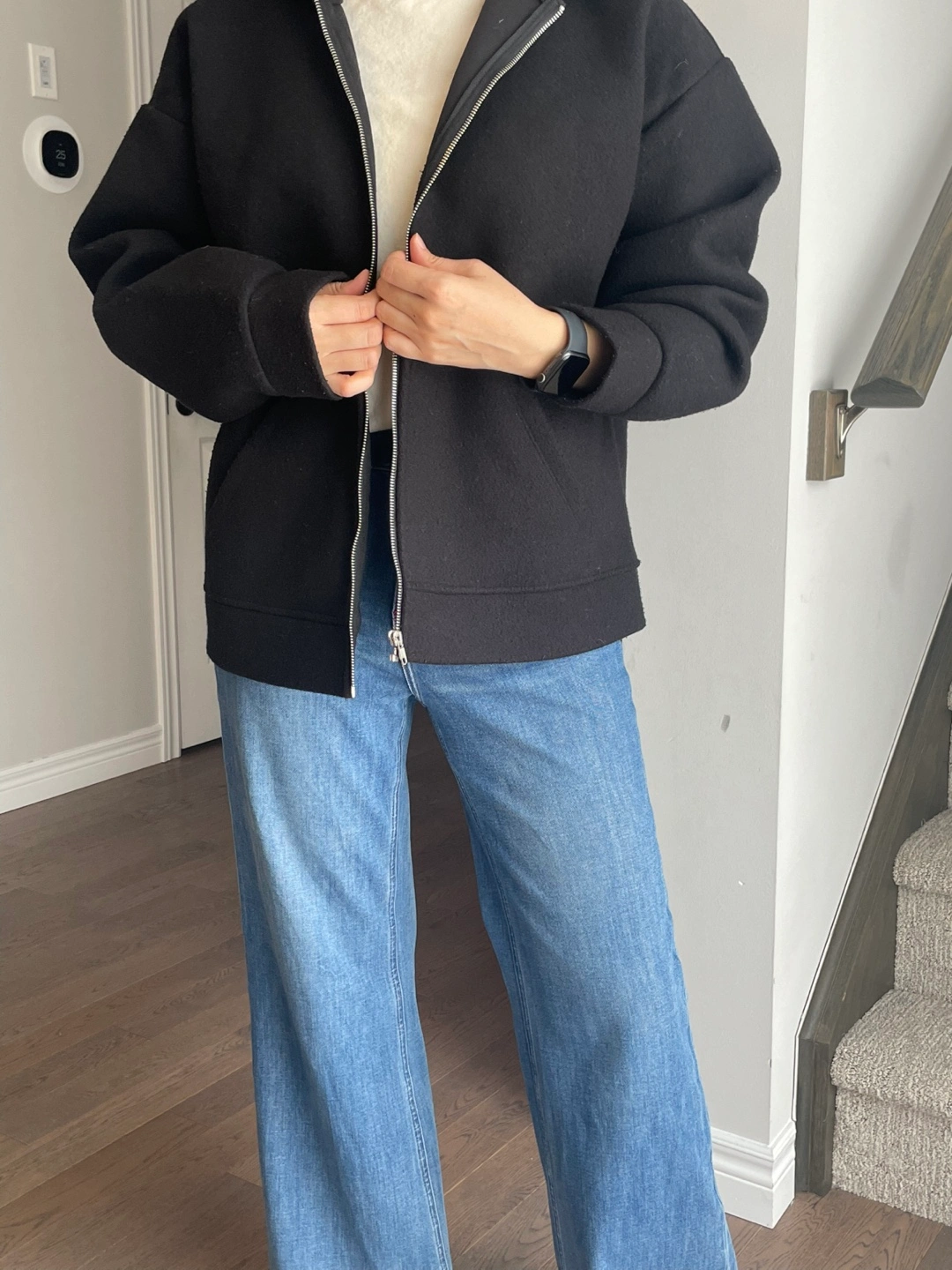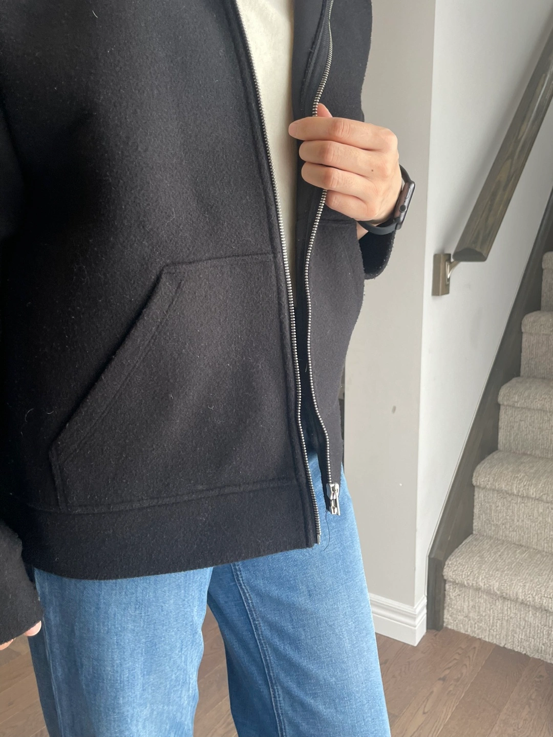 Cozy black zip-up hoodie with a soft feel. It's got a comfortable fit and two front pockets. Perfect for layering on cooler days!