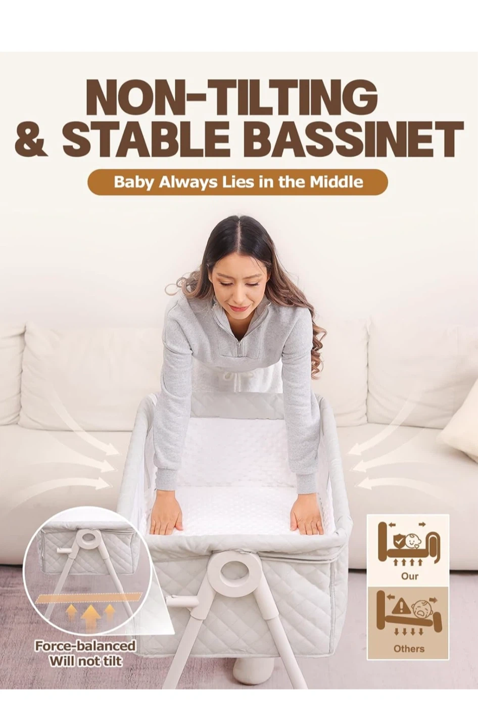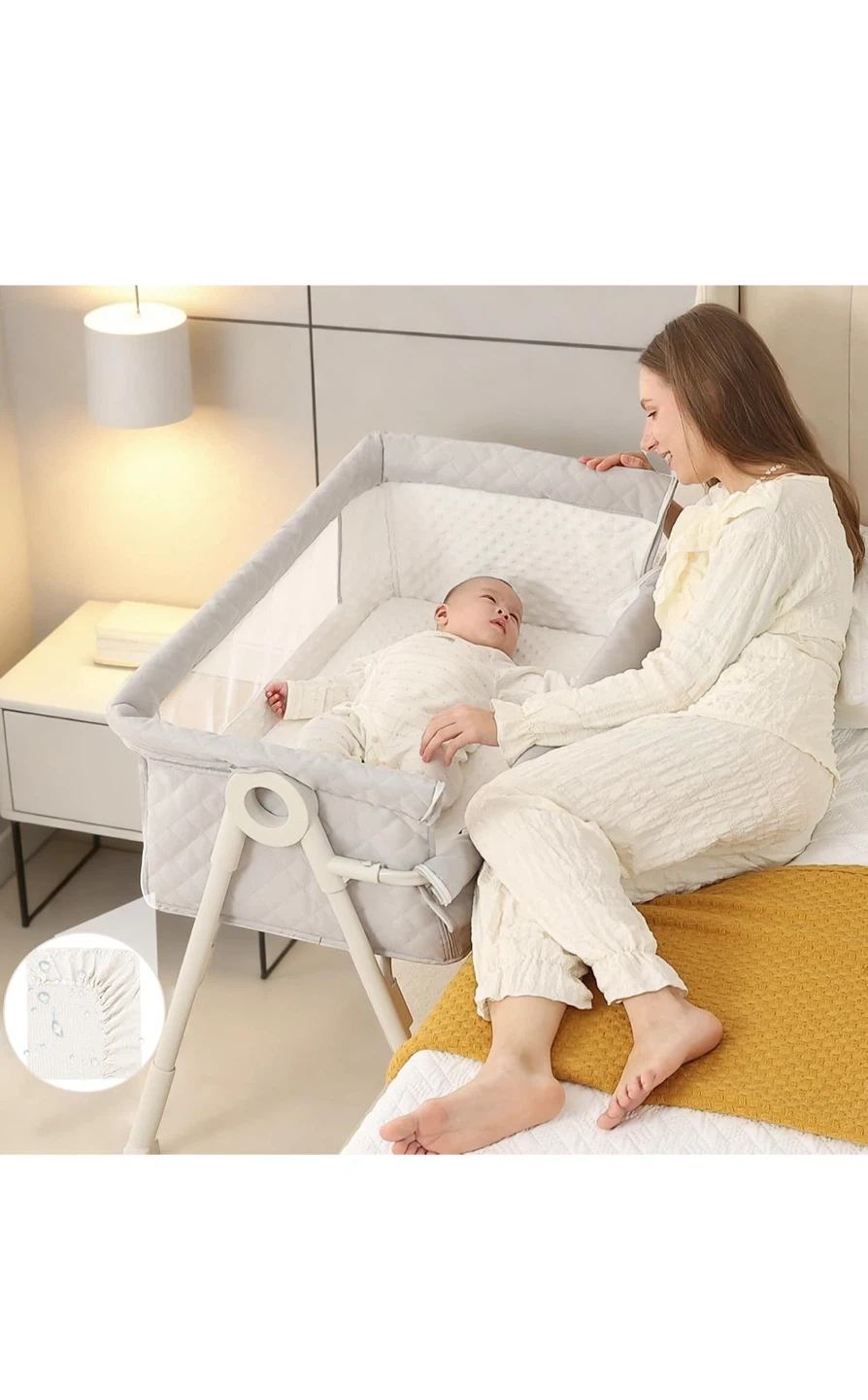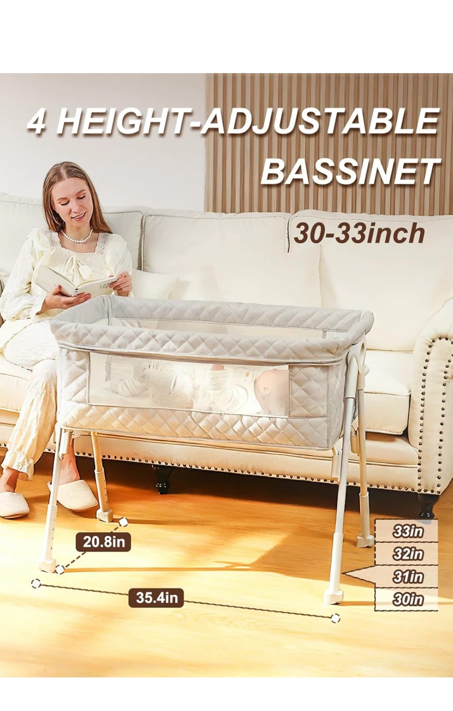 This is a 4 height-adjustable bassinet. It's designed to be non-tilting and stable, with a comfy mattress and waterproof sheets. It features a built-in wheel design for mobility and automatically locks for safety.