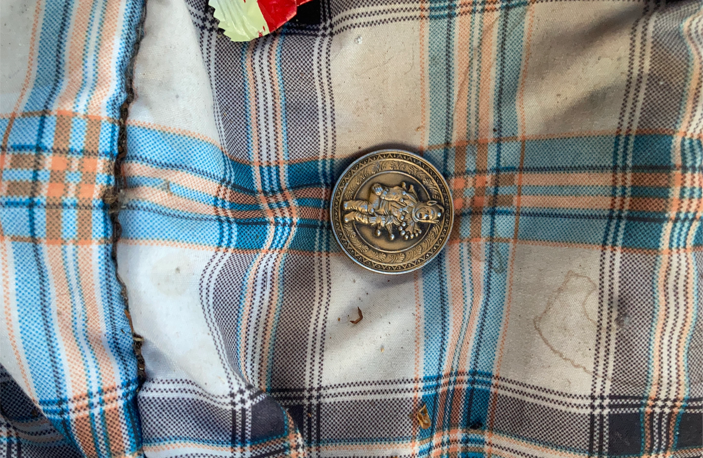 The listing features a piece of plaid fabric with a round metal medallion. The fabric shows signs of wear and staining. The medallion has a decorative design.