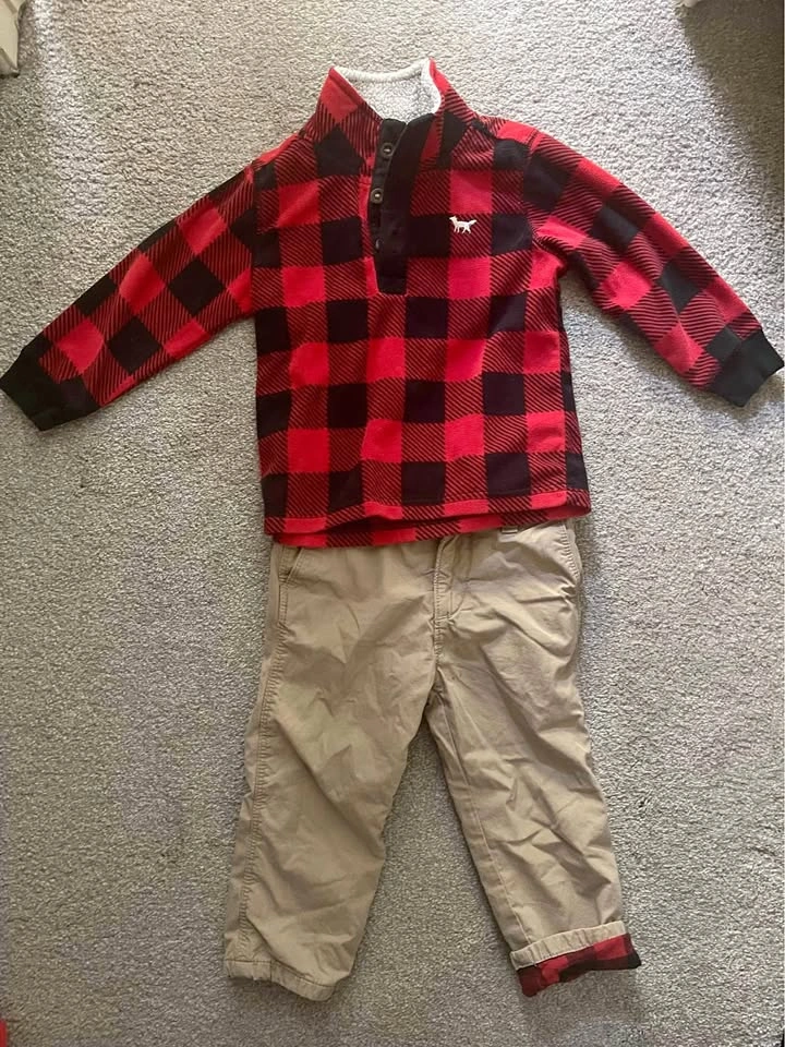 Fleece top is Carter’s and pants are GAP brand. Pants are double layer, adjustable and 100% cotton inside and out. It has a small pen mark (coin for the size). Pet free smoke free home.