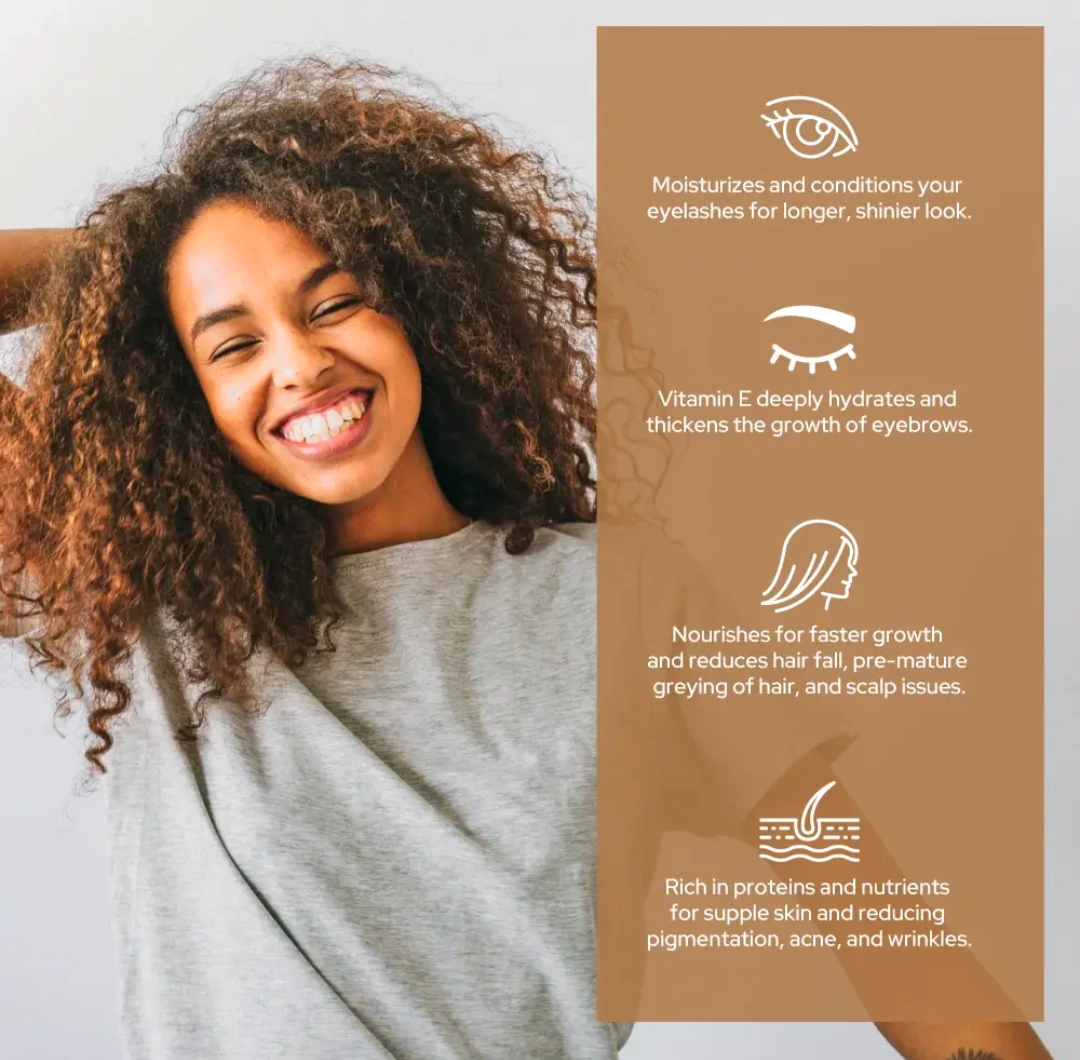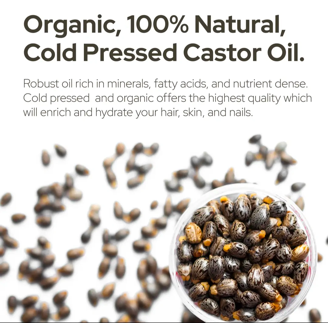 Cold pressed, hexane free, 100% natural castor oil. For hair, eyelashes, brows, and skin. USDA Organic.