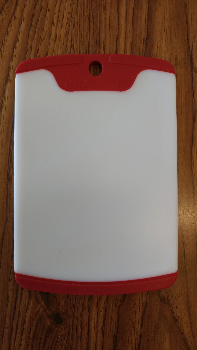 344Selling a plastic cutting board with red trim and a white cutting surface. It's in great condition and ready for a new home!