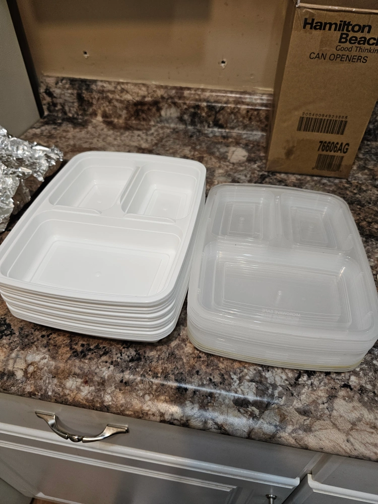 Selling a stack of food containers. They are white and have three compartments. Perfect for meal prepping or storing leftovers!