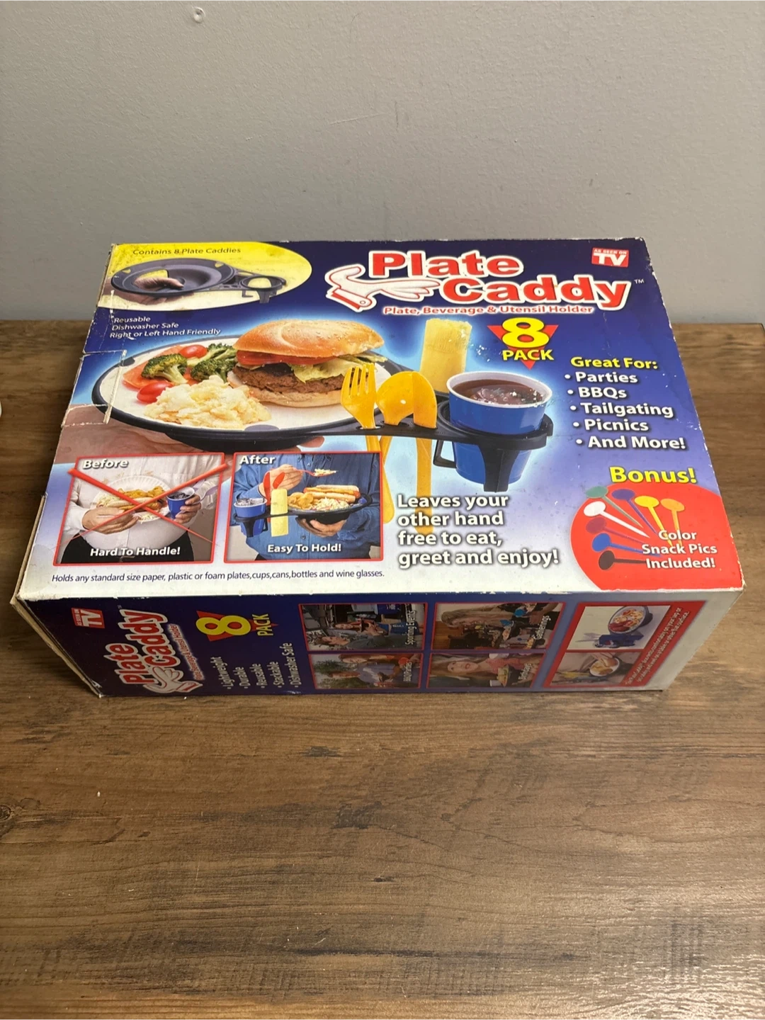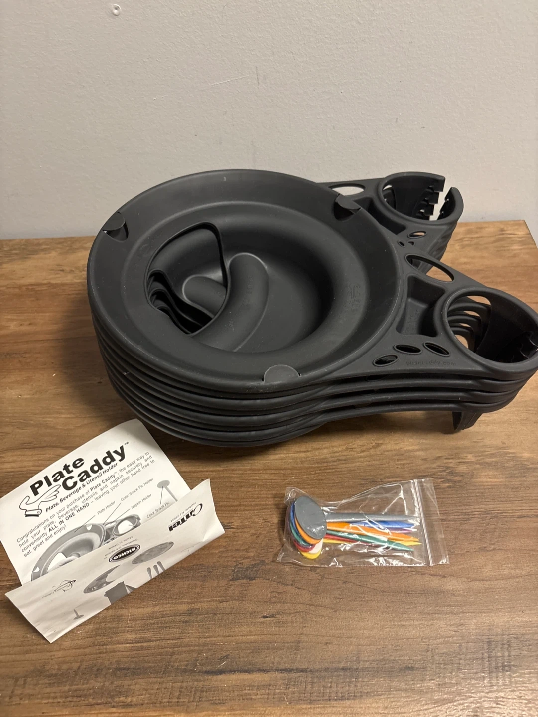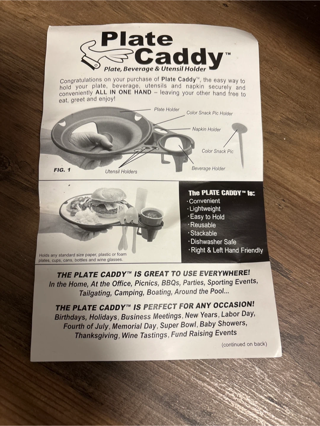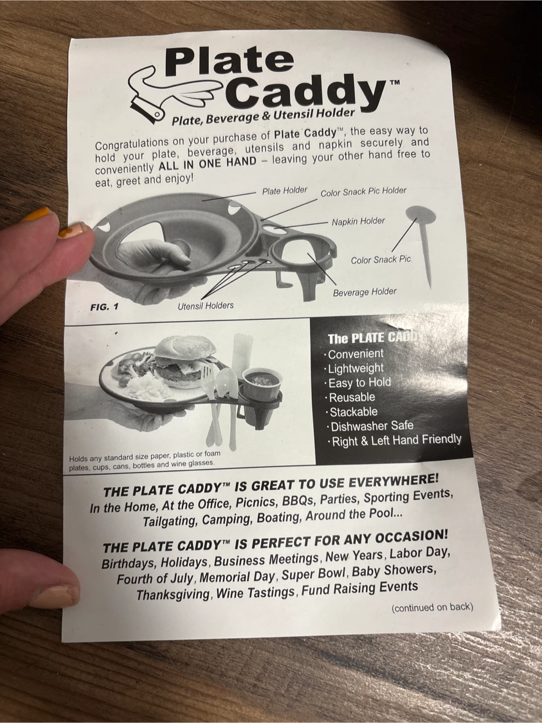 Selling a Plate Caddy, a plate, beverage and utensil holder! It's lightweight, durable, reusable, stackable and dishwasher safe. Perfect for parties, BBQs, tailgating, picnics and more! It conveniently holds your plate, utensils and napkin securely, leaving your other hand free to eat, greet, and enjoy! Comes with colour snack pics included!