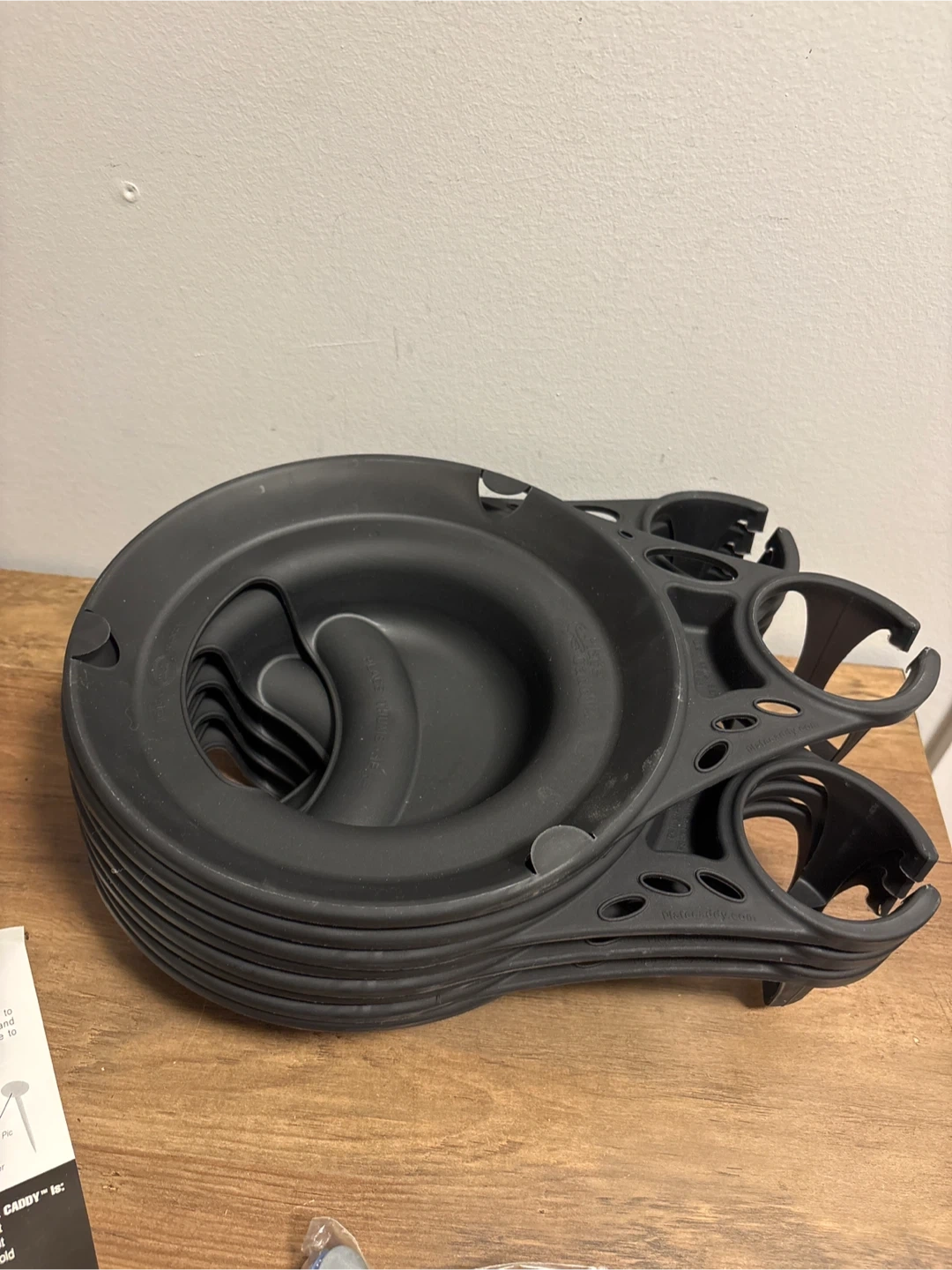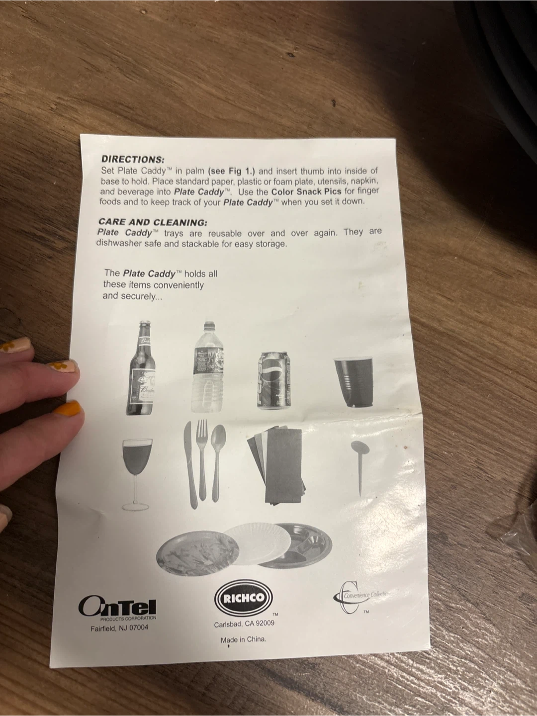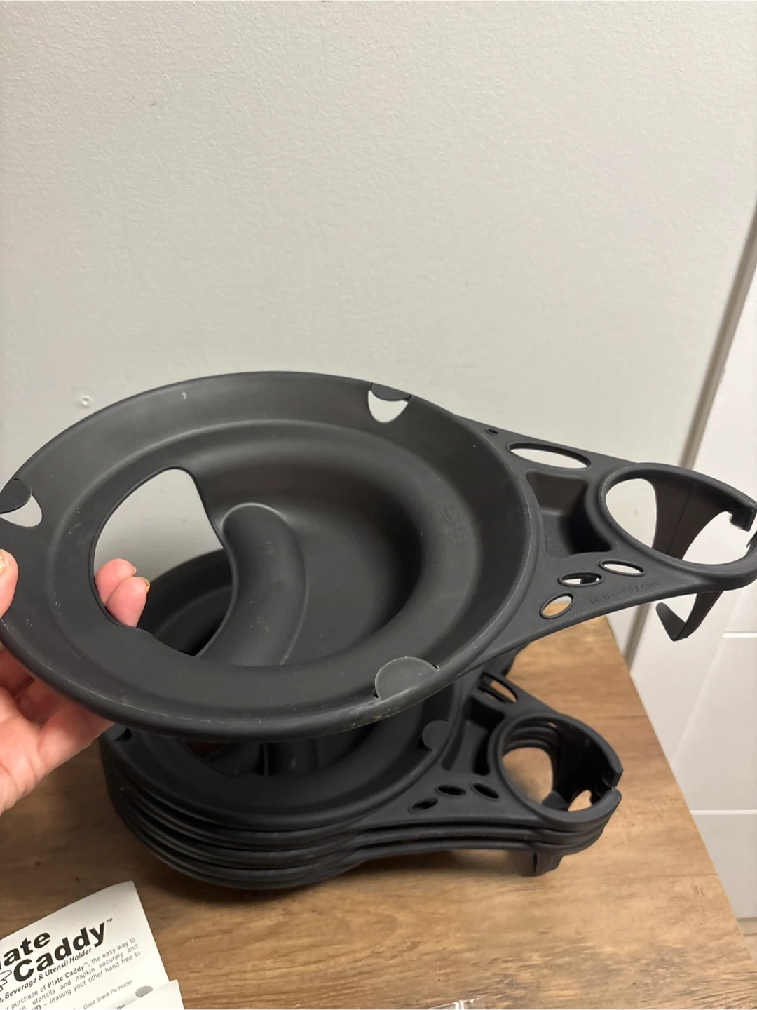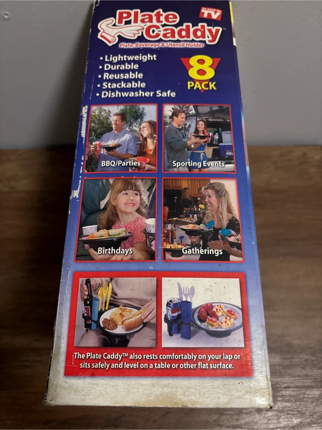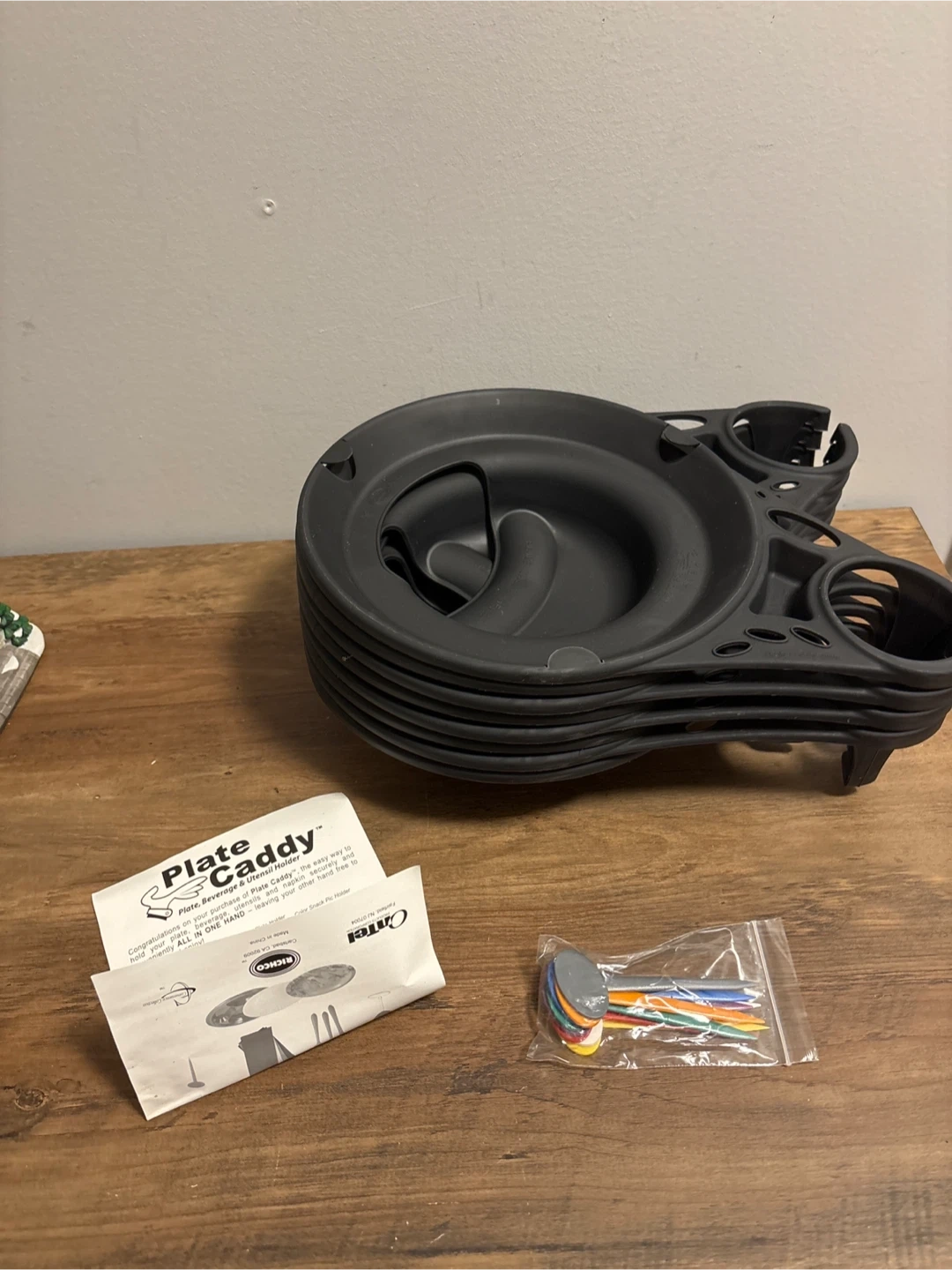 Selling a Plate Caddy, a plate, beverage and utensil holder! It's lightweight, durable, reusable, stackable and dishwasher safe. Perfect for parties, BBQs, tailgating, picnics and more! It conveniently holds your plate, utensils and napkin securely, leaving your other hand free to eat, greet, and enjoy! Comes with colour snack pics included!