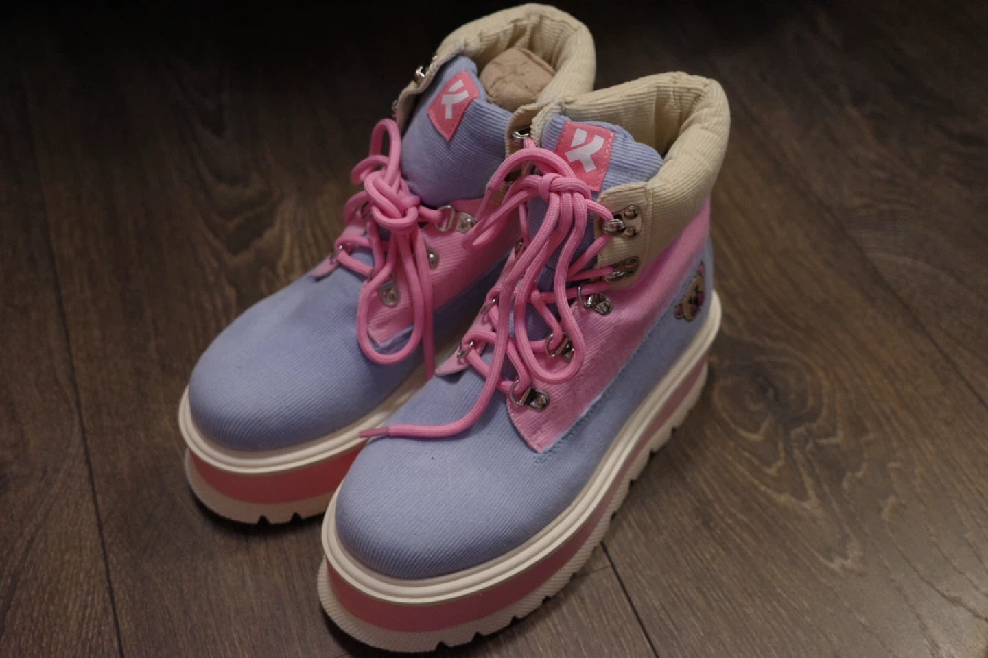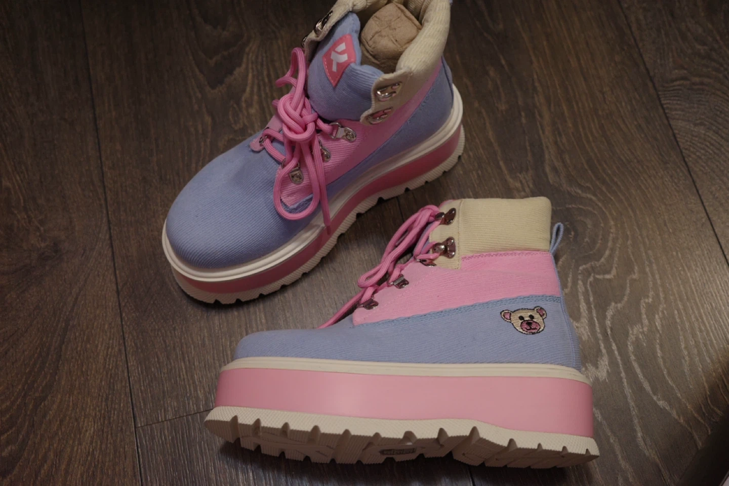 26Selling a pair of platform boots in size US7. These are a cute light blue and pink colour. They come with the original box!
