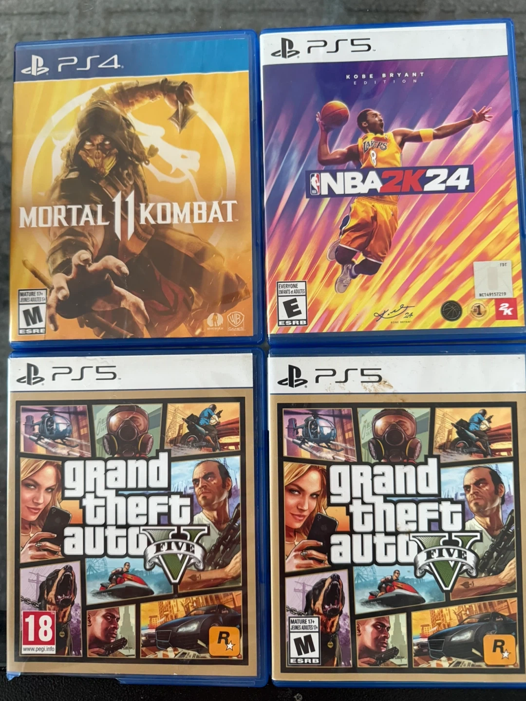 104 disc 1. mortal kombat ps4 2. NBA 2k24 ps5 3. GTA5 ps5 4. GTA5 ps5 20$each