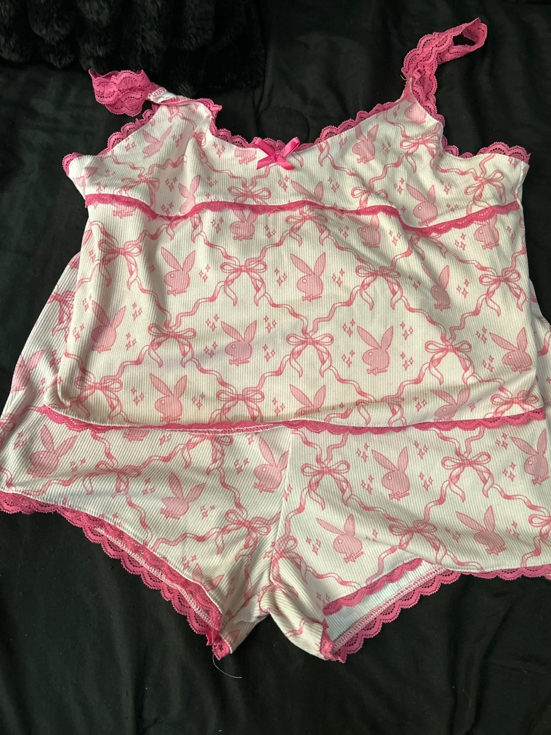 76Super cute Playboy lingerie set in size XL/TG! It features a playful pink and white pattern with lace trim. Perfect for lounging or adding a touch of fun to your sleepwear collection