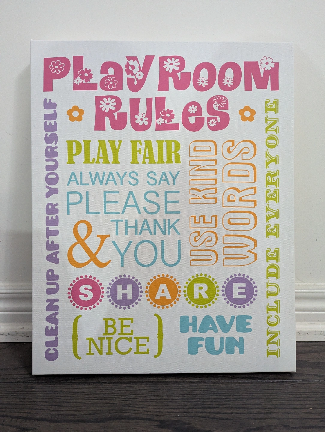 10Add a pop of colour and positivity to your playroom with this canvas art! It features a playful design with reminders to play fair, say please and thank you, use kind words, share, be nice, and have fun! It also encourages cleaning up after yourself and including everyone