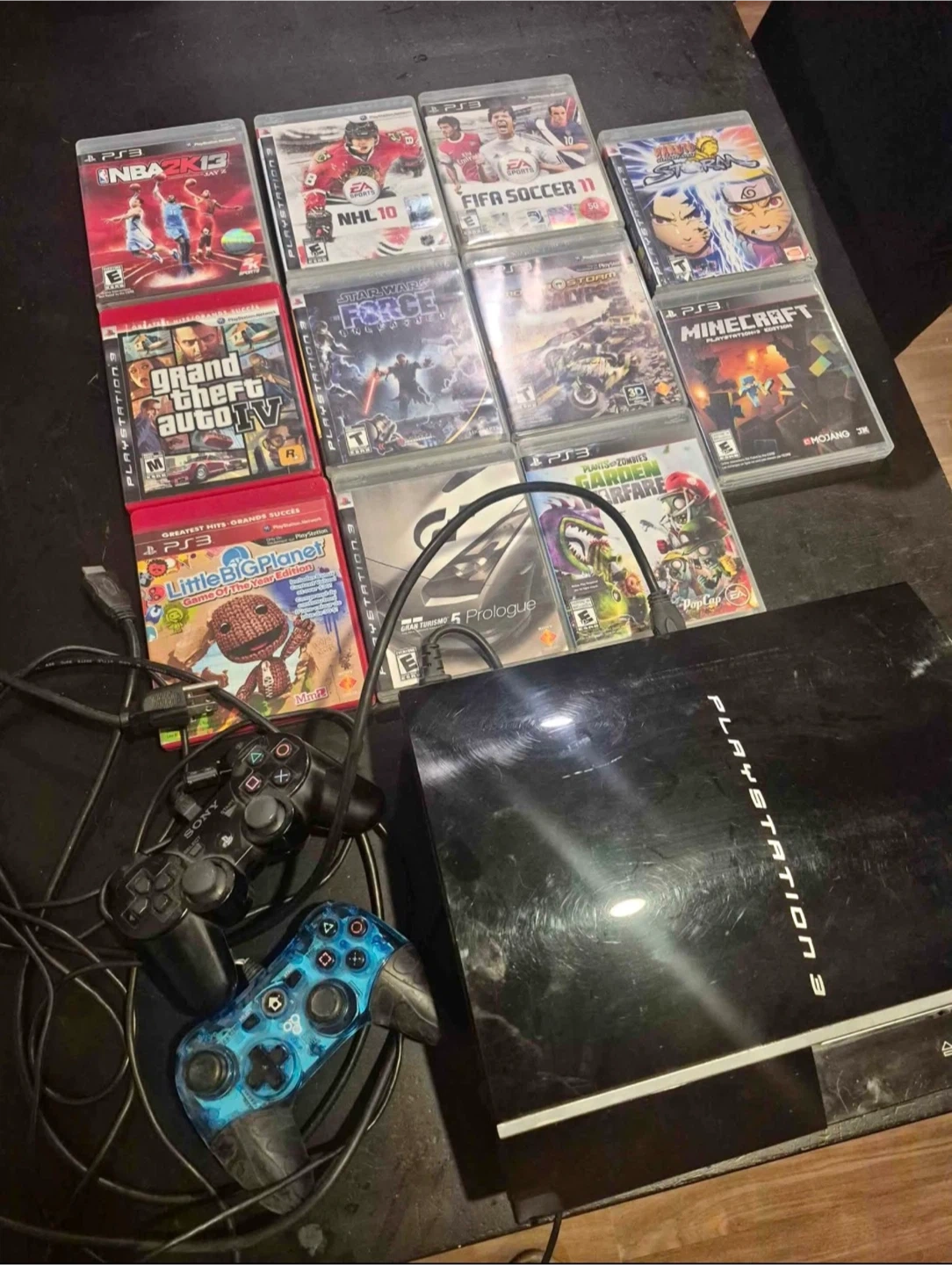65Selling a PlayStation 3 console with a bunch of games! Includes titles like NBA 2K13, NHL 10, FIFA Soccer 11, Naruto Shippuden, Grand Theft Auto IV, Star Wars Force Unleashed, MotorStorm Apocalypse, Minecraft PlayStation 3 Edition, LittleBigPlanet Game of the Year Edition, Gran Turismo 5 Prologue, and Plants vs Zombies Garden Warfare. Comes with controllers and cables as pictured ( No HDMI cable you can buy at amazon or walmart for $7)