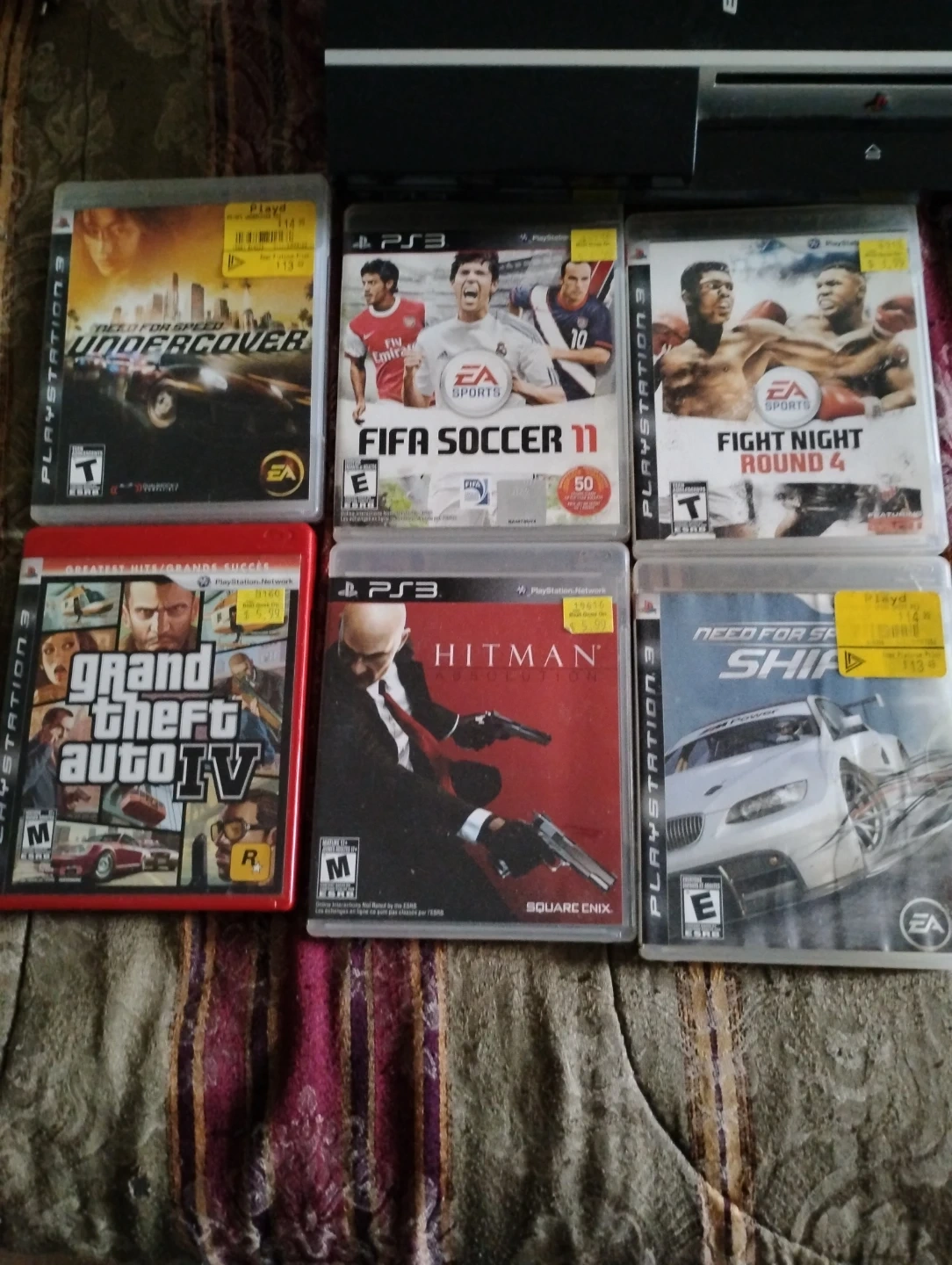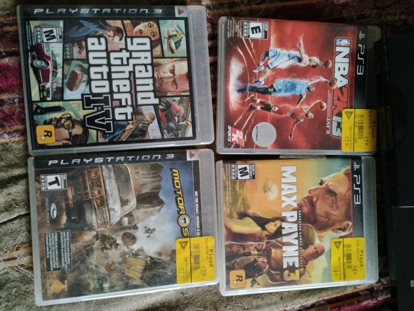 86Selling a PlayStation 3 console along with a selection of games. The games include titles like Grand Theft Auto IV & V, NBA 2K13, Motorstorm, Max Payne 3, Need for Speed Undercover & Shift, FIFA Soccer 11, and Fight Night Round 4