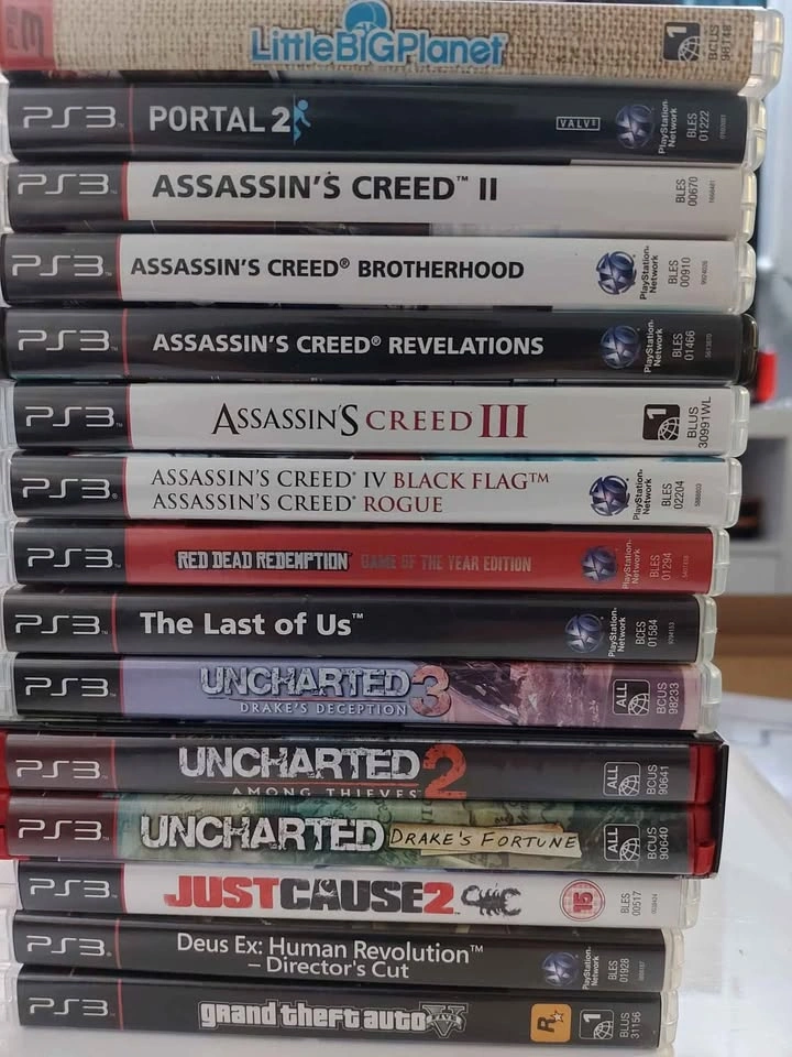 PlayStation 3 (PS3) with a European power plug (Just need a travel adapter to plug into other outlets). 1 Dualshock controller. 250GB memory. Runs perfectly and it is already restored to factory condition. 15 games(Can be sold separately for CAD 5 each): Portal 2 Little Big Planet Assassin's Creed 2 AC Brotherhood AC Revelations AC 3 AC 4 Black Flag + Rogue Red Dead Redemption The Last of Us Uncharted 1-3 Just Cause 2 Deus Ex Human Revolution GTA 5