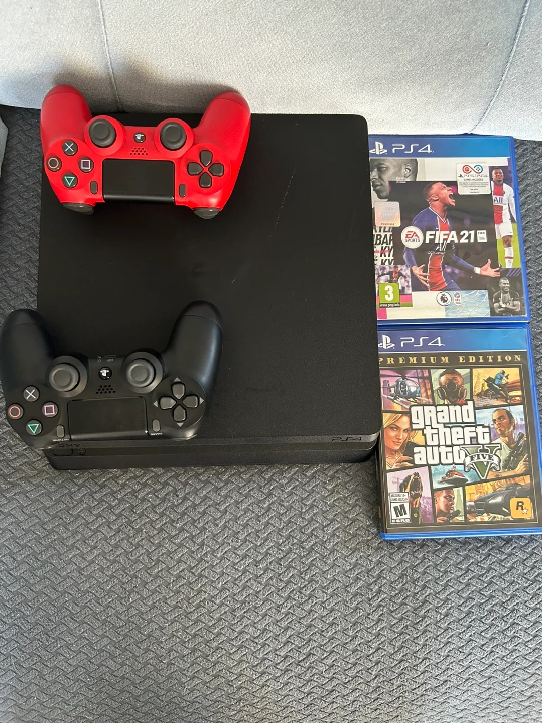 Selling a PlayStation 4 console. It comes with two controllers (one red and one black) and two games: FIFA 21 and Grand Theft Auto V Premium Edition. Great for some gaming fun!