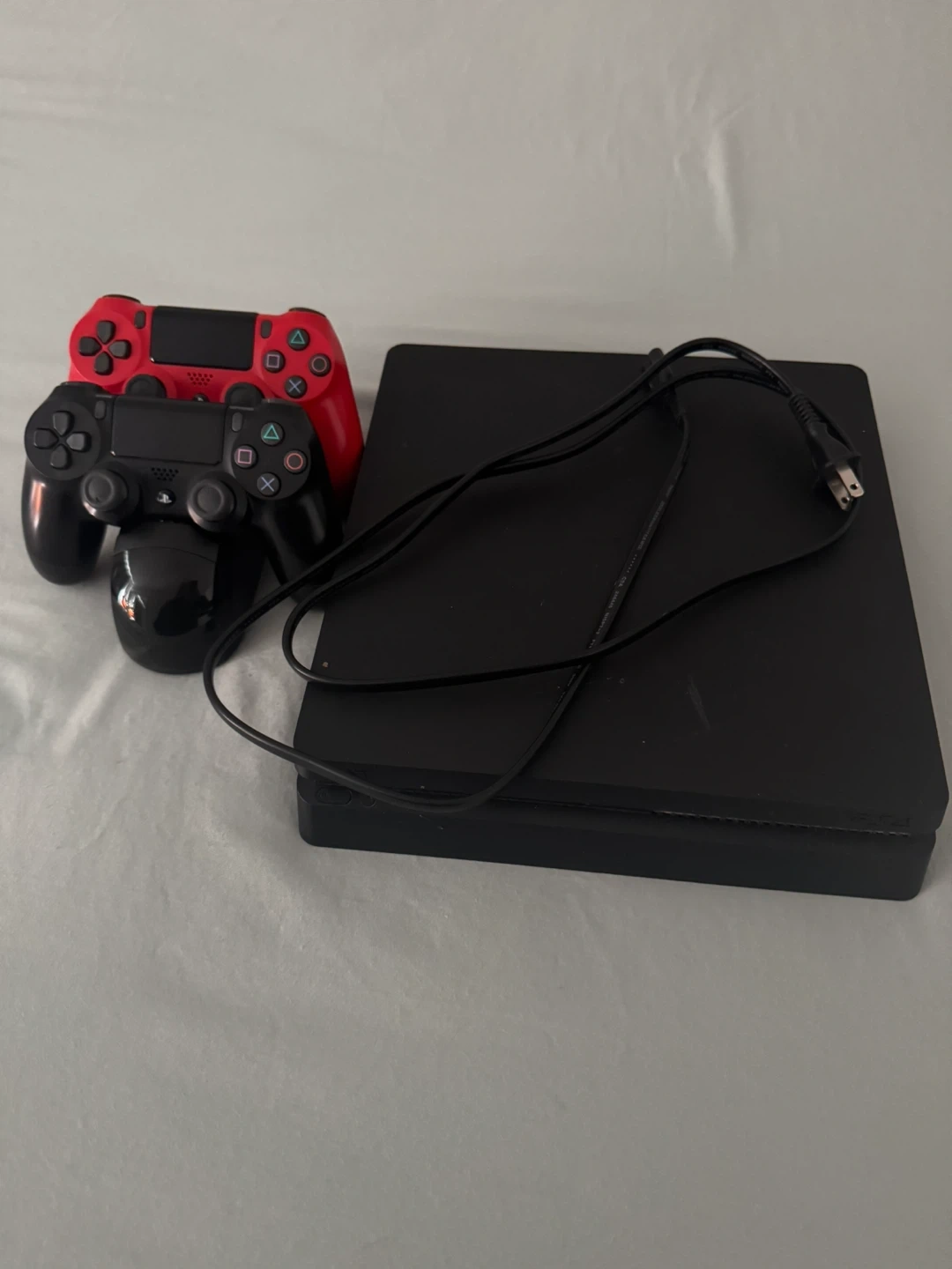 65Selling a PlayStation 4 console with two controllers (one red, one black)an. Includes the console, two controllers,charging port, and the necessary cable to hook it up to your TV. Ready for some gaming!