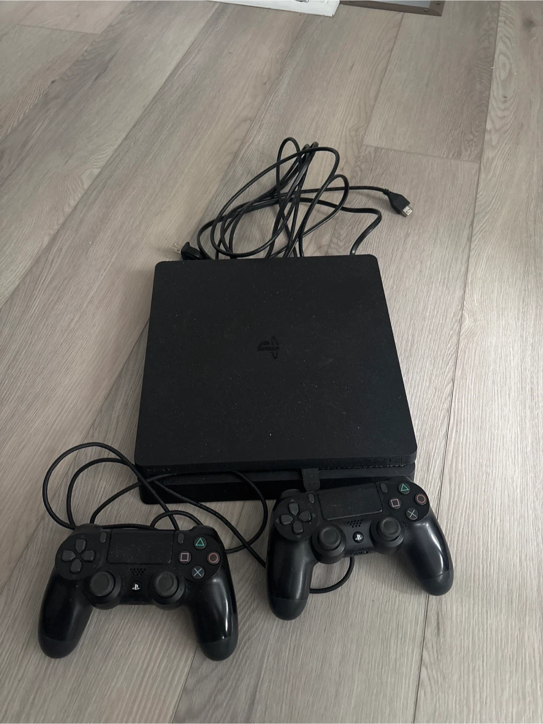 Selling a used PlayStation 4 Slim in black. It comes with two controllers and all the necessary cables. Ready for gaming!